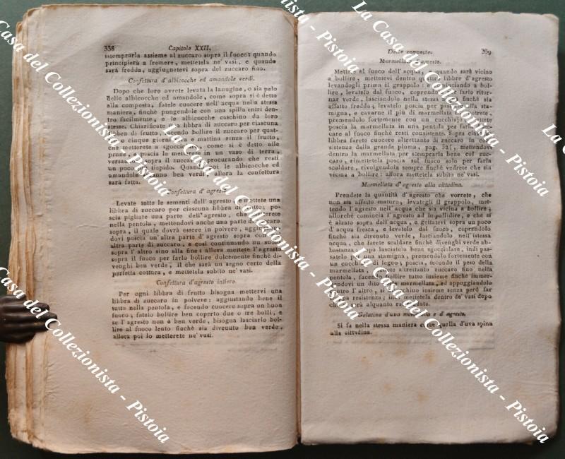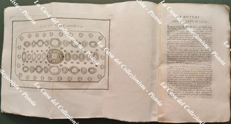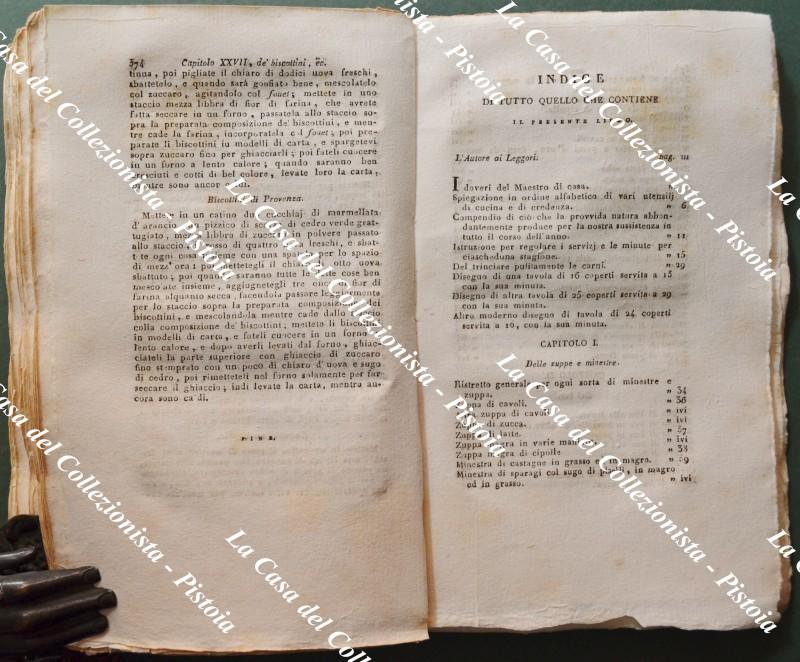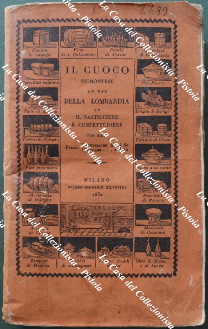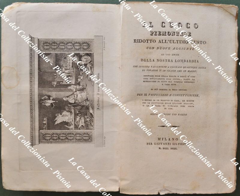 (Gastronomia - Piemonte) IL CUOCO PIEMONTESE RIDOTTO ALL'ULTIMO GUSTO. CON NUOVE AGGIUNTE AD USO ANCHE DELLA NOSTRA LOMBARDIA CHE INSEGNE A CUCINARE QUALUNQUE SORTA DI VIVANDE Sì IN GRASSO CHE IN MAGRO; istruisce pure nella scelta e bontà d'ogni cosa appartenente alla cucina, dando la spiegazione di tutti gli utensili necessari a tale arte, di più insegna il vero metodo PER IL PASTICCIERE E CONFETTURIERE, i diveri di un maestro di casa, le minute per le provvisioni nelle quattro stagioni, e la maniera di trinciare ogni sorta di cibi. Sesta edizione con figure. Milano, Per Giovanni Silvestri, 1832. Cm 12,5x20, brossura editoriale figurata, pp. (4) +402 + (2). Antiporta incisa da A. Biasioli riproducente un interno di cucina fiamminga e, all'inizio fuori testo, 3 tavole ripiegate con note esplicative: 1) Tavola da 16 coperti servita a 13 per cena. 2) Servizio a 16 per 24 coperti. 3) Tavola di 26 Coperti servita a 29. L'anonimo autore fornisce centinaia di ricette per zuppe, primi piatti, piati di carne (bue, vitello, maiale, montone, agnello, pollame, selvaggina), piatti di pesce, legumi, insalata, uova, formaggi, frutta, dolci, prosciutti e salumi dando inoltre indicazione sul come tagliare le carni e come servire i cibi a tavola nel modo più appropriato. Esemplare parzialmente intonso; interno buono con minime tracce d'uso; la brossura originale illustrata è stata restaurata agli snodi dei piatti e presenta modeste abrasioni al piatto posteriore. (Rif.F5667-76)