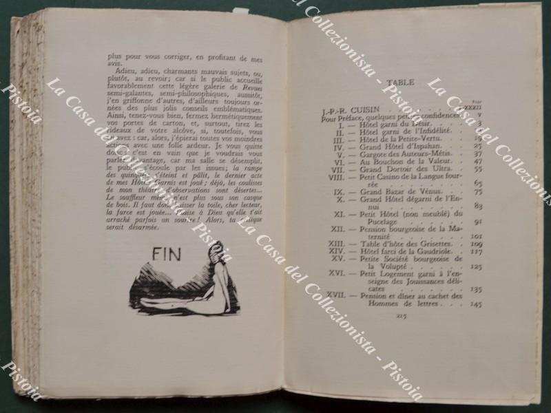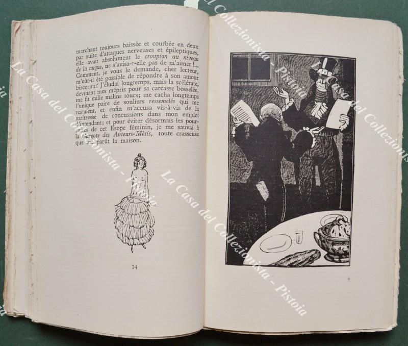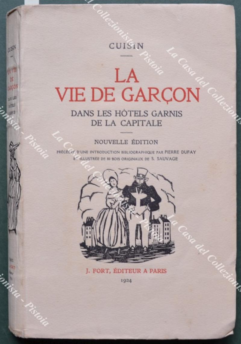 (Letteratura erotica) CUISIN. LA VIE DE GARCON DANS LES HOTELS GARNIS DE LA CAPITALE. Nouvelle edition précédée d'une introduction bibliographique par PIERRE DUFAY et illustrée de 80 bois originaux de S. SAUVAGE. Parigi, J. Fort editeur, 1924. Cm 14x22, brossura editoriale illustrata. Pp. XXXII + 216 con 80 xilografie originali di Sylvain Sauvage di cui 26 fuori testo. Tiratura di 1200 esemplari numerati; il nostro esemplare reca il n. 776 su carta vergata gotica. Buona/ottima conservazione. (Rif.F7651-77)