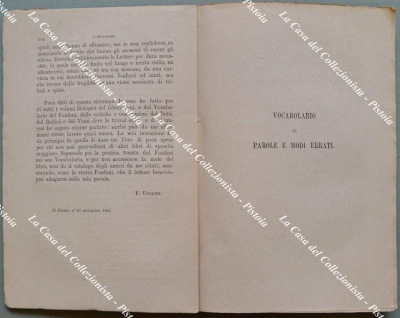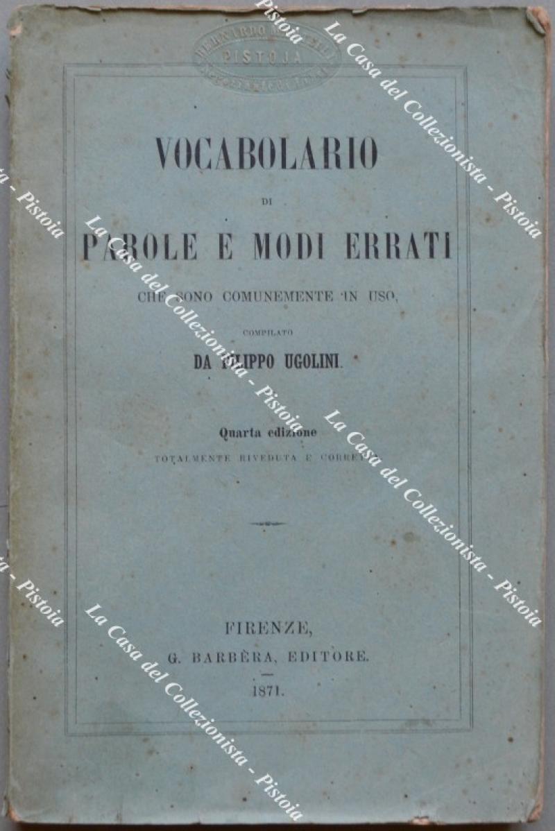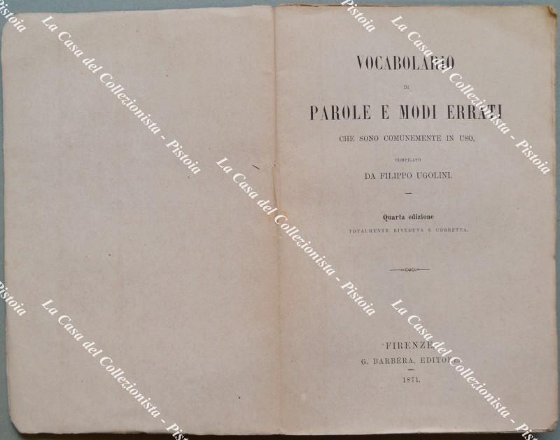 (Lingua italiana) UGOLINI FILIPPO. VOCABOLARIO DI PAROLE E MODI ERRATI CHE SONO COMUNEMENTE IN USO. Quarta edizione totalmente riveduta e corretta. Firenze, Barbera, 1871. Cm 12x19. Pp. XXII + 252, brossura orignale. (Rif.F5989)