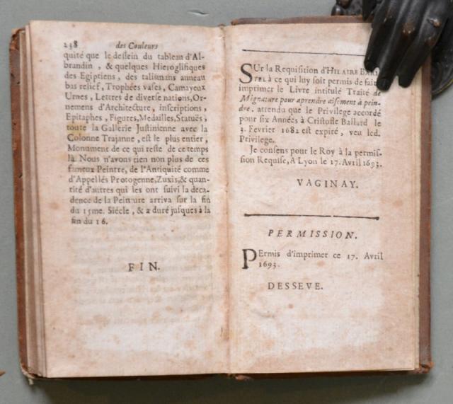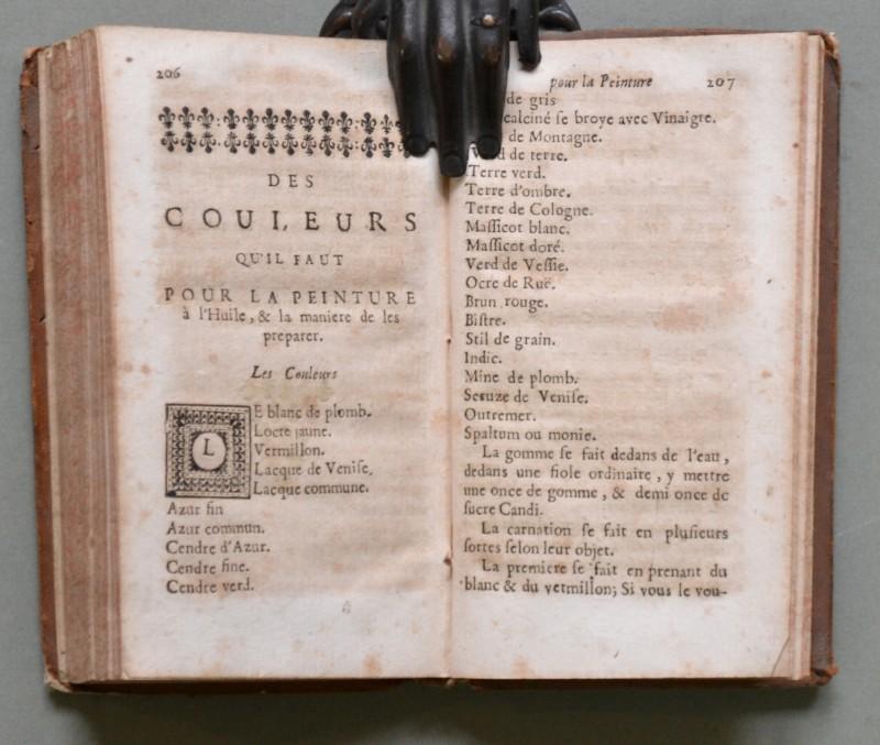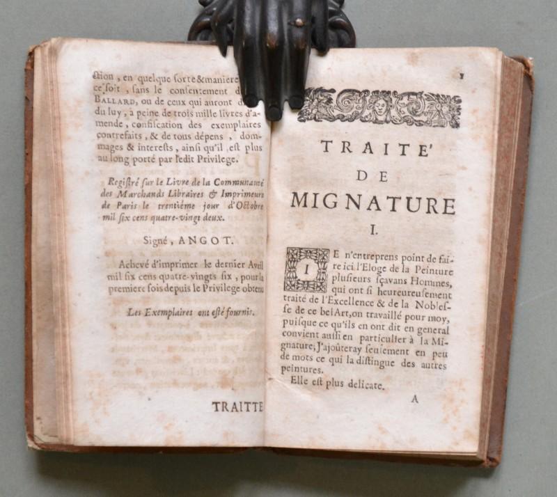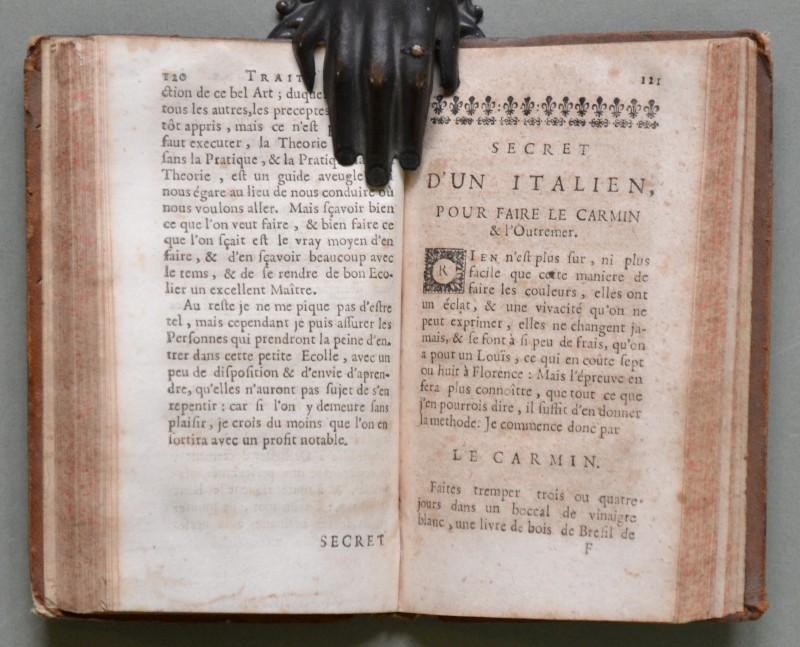 Miniatura, anno 1693. ANONIMO (CLAUDE BOUTET). TRAITTE’ DE MIGNATURE POUR APPRENDRE aisément à Peindre sans Maitre, Avec le Secret de faire les plus belles Couleurs, l’Orbruny, et l’Or en Coquille. SIXIE’ME EDITION. Corrigée, reveue & augmentée d’un Traittè de la Peinture de son objet, de son origine descouleurs pour Peindre à l’huile & la maniere de lespreparer. Avec une explication des termes de Peinture, et un Discours pour Peindre à Fresque. Lione, Baritel, 1693. In 24° (cm 7,7x14,2), rilegatura coeva in piena pelle con al dorso nervi e fregi in oro. Pagine (24) + 238 + (2). Opera completa. Interno in buona conservazione eccetto normali bruniture dovute al tipo di carta, qualche difetto alla legatura (per lo più sul dorso). (Rif.D4553 - 556/68)