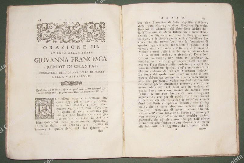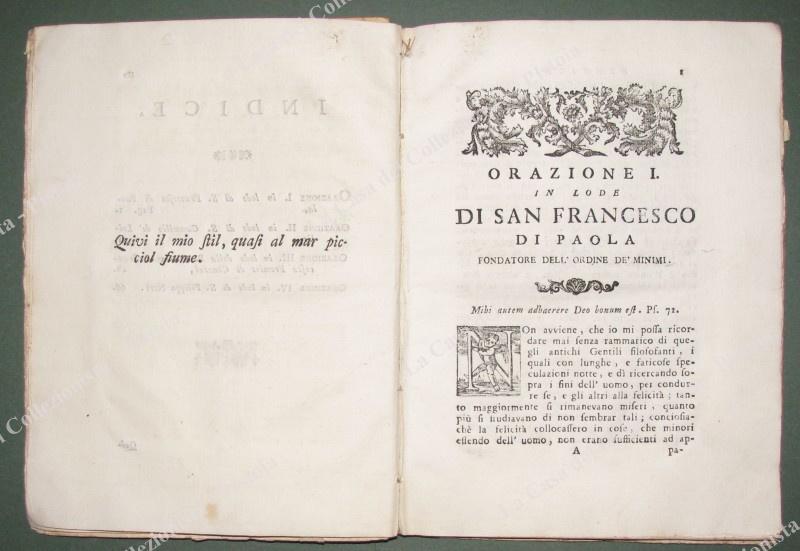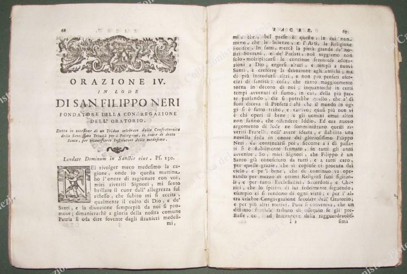 Orazioni religiose-ediz.'700. RIGNONI GIOVANNI COSTANZO. "ORAZIONI SACRE TOSCANE". Firenze, Appresso Pietro Gaetano Viviani all'insegna di Giano, 1757. Cm 17x22,5 legatura coeva in cartone. Pp. XI + (1) + 85 + (3). Vignetta incisa in rame al frontespizio, frontalini, finalini e capolettera figurati. L'opera contiene: Orazione in lode di S. Francesco di Paola - Orazione in lode di S. Camillo de Lellis - Orazione in lode della B. Giovanna Francesca Fremiot di Chantal - Orazione in lode di S. Filippo Neri. Interno in fresca conservazione, legatura con segni d'usura e danni alla parte superiore e inferiore del dorso. (Rif.F0022)
