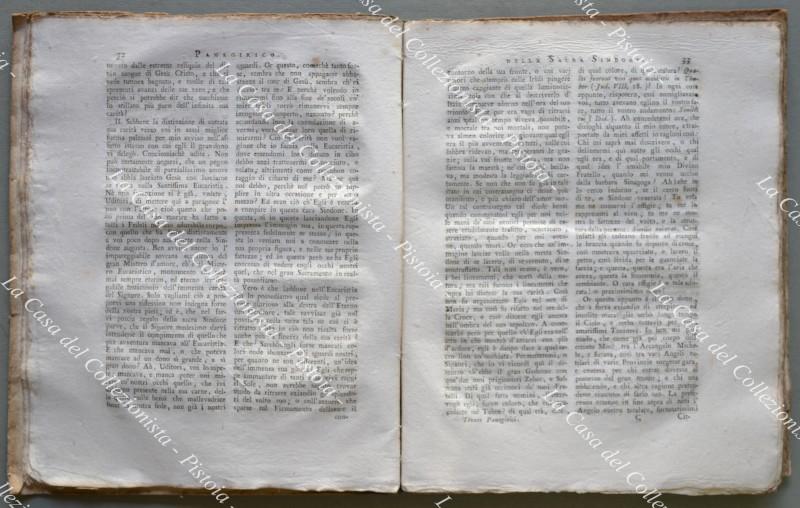 (Religione – ediz. ‘700) TRENTO GIROLAMO. PANEGIRICI E DISCORSI MORALI DEL SIG. ABATE GIROLAMO TRENTO NOBILE PADOVANO. Seconda edizione. Venezia, presso Tommaso Bettinelli, 1788. In 4° (cm 20x25), cartonatura alla rustica. Pp. 268, esemplare in barbe. Buona conservazione, eccetto lievi bruniture. (Rif.C7804-69)
