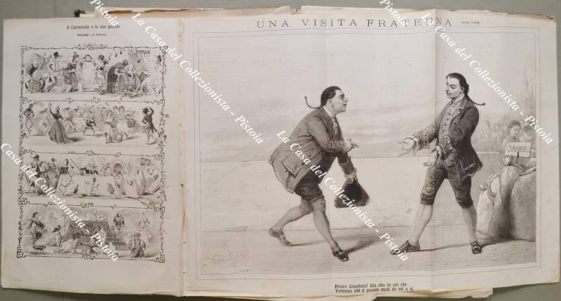 (Periodico satirico ill. '800) LO SPIRITO FOLLETTO. ANNATA 1866. 37 numeri (su 52). Giornale umoristico illustrato. Settimanale (usciva il giovedì) edito a Milano da Sonzogno. In folio (cm 30x43), pp. 8 a numero. Celebre per le splendide illustrazioni in litografia, anche a doppia pagina e presenti in ogni numero, ad opera di Gonin, Teja, Maironi, Gorra, Greppi, Cadolini. Sciolti, provenienti da rilegatura. Qualche accettabile difetto. Sono uniti, della stessa annata, altri numeri scompleti. Quasi sempre assenti sono presenti, per ogni numero, le 4 pagine gialle a stampa che contenevano il giornale.(Rif.F5941-76)