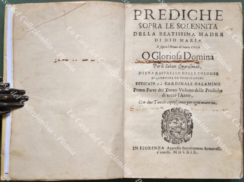 (Religione - ediz. ‘600) DELLE COLOMBE RAFFAELE. PREDICHE SOPRA LE SOLENNITA’ DELLA BEATISSIMA MADRE DI DIO... In Fiorenza, Appresso Bartolomeo Sermartelli e Fratelli, 1619.