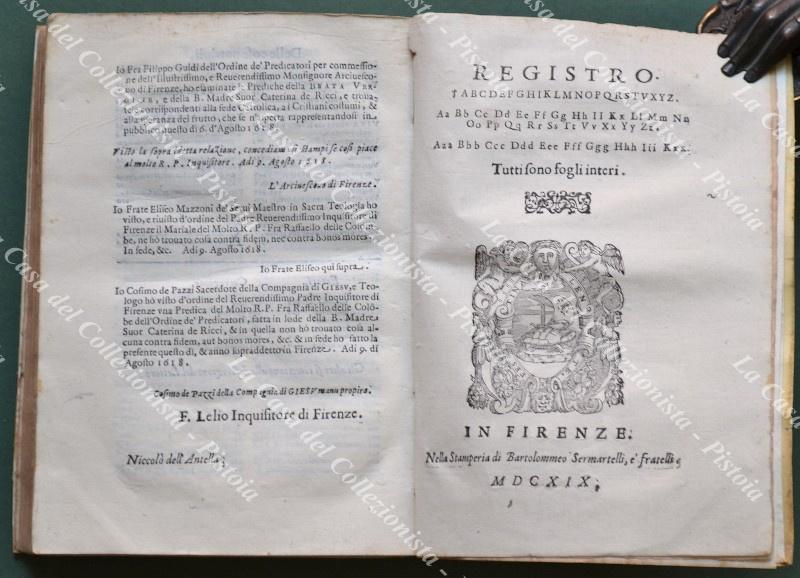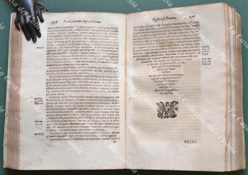 (Religione - ediz. ‘600) DELLE COLOMBE RAFFAELE. PREDICHE SOPRA LE SOLENNITA’ DELLA BEATISSIMA MADRE DI DIO MARIA E SOPRA L’HINNO DI SANTA CHIESA O GLORIOSA DOMINA PER LI SABATI QUARESIMALI, ... Prima Parte del terzo volume delle Prediche di tutto l’Anno, Con due tavole copiosissime per ogni materia. In Fiorenza, Appresso Bartolomeo Sermartelli e Fratelli, 1619. Cm 15.2x22.2, pergamena molle coeva (restauri al dorso e fogli bianchi di guardia sostituiti). Pp. (8) + pp. 400 + pp. (48). Bella marca xilografica al frontespizio e sul colophon, iniziali e finalini xilografici. Volume solido, interno buono. Vecchie firme d’appartenenza al frontespzio. (Rif.F0999-493/74)