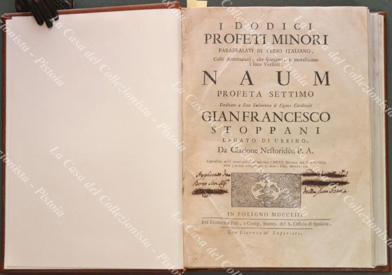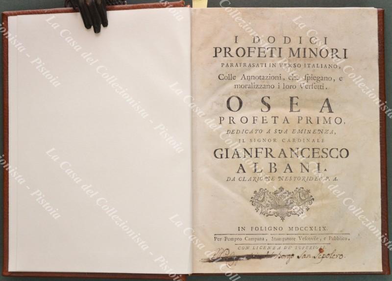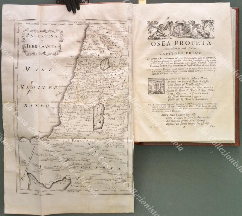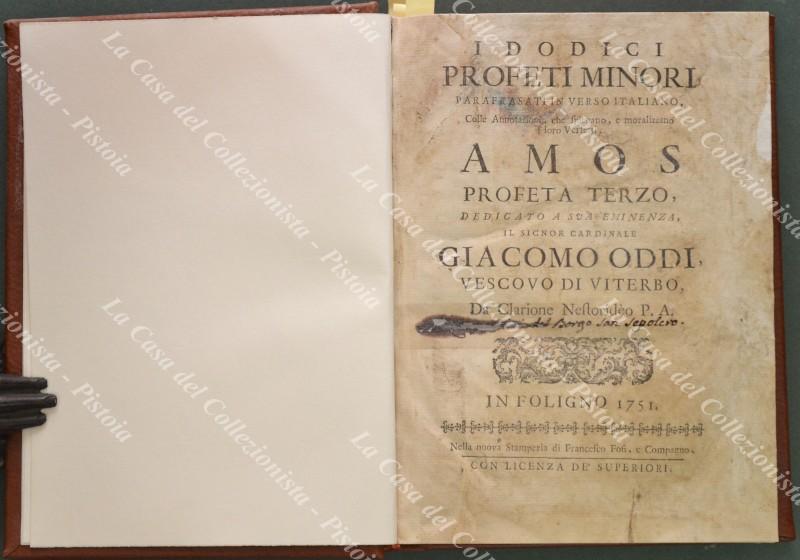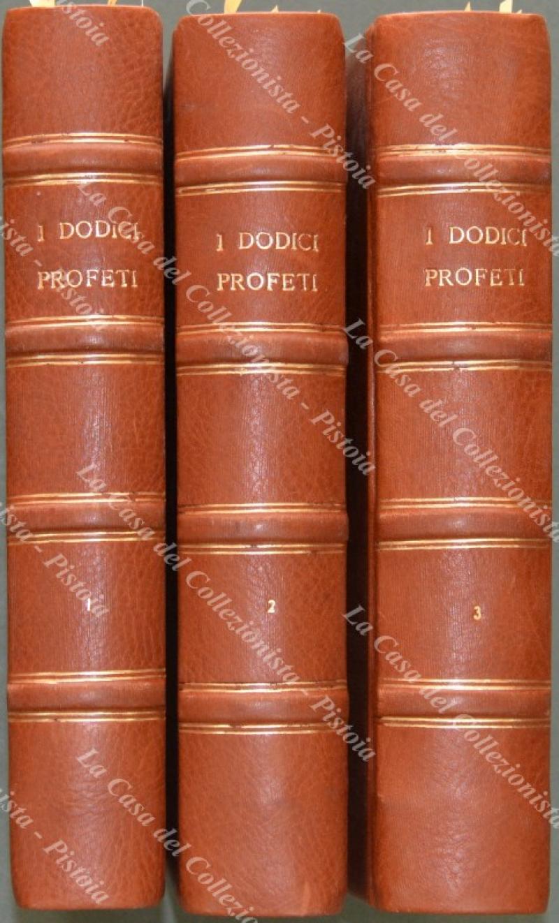 (Religione - ediz. ‘700) VINCENZO DA SANT’ERACLITO. I DODICI PROFETI MINORI PARAFRASATI IN VERSO ITALIANO, Colle Annotazioni, che spiegano, e moralizzano i loro Versetti. Foligno, Pompeo Campana, 1749-1754. Tre tomi con belle legature recenti in piena pelle con nervi e titolo in oro ai dorsi e piatti anteriori inquadrati da bella cornice dorata lavorata a piccoli ferri, cm 17x23,5. Contengono 12 volumi: 1) OSEA. Pagine XCVI + 205 + (3) con due carte geografiche ripieg. fuori testo. 2) GIOELE. Pagine XXVIII + 56. 3) AMOS. Pagine XVI + 180. 4) ABDIA. Pagine 36. 5) GIONA. Pagine XVI + 58. 6) MICHEA. Pagine XVI + 116. 7) NAUM. Pagine XVI + 52. 8) ABACUCCO. Pagine X + 54. 9) SOFONIA. Pagine VI + 48. 10) AGGEO. Pagine XII + 36. 11) Zaccheria. Pagine XII + 224. 12) MALACHIA. Pagine XVI + 72. Legature belle e ottimamente conservate. Interni con alcuni difetti: antiche forme d’appartenenza ai frontespizi con alcuni riforzi a retro causa ossidazione dell’inchiostro. Qualche brunitura o ingiallimento. Pagine in parte lievemente deformate. Frontespizio del vol. terzo sporco e con riparazioni laterali. Ultime tre carte del dodicesimo volume con macchie e restauri con minimo fastidio al testo. Altre piccole imperfezioni. Opera completa. Esemplare, nonostante le mende, in condizioni accettabili. (Rif.F0568-74)
