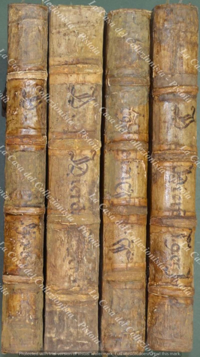 (Religione - rara ediz. ‘600) GERONIMO (San). SANCTI HIERONYMI STRIDONIENSIS OPERA OMNIA quae extant. MARIANI VICTORII REATINI EPISCOPI AMERINI labor & Studio ad fidem M. S. & vetusti. exemplarium emendata, argumentis & Scholiis illustrata. VITA ITEM S. HIERON. EX IPSIUS seriptis ad eodem Victor collecta. EDITIO NOVISSIMA, IN QUA qui accesserit, vide lector folio sequenti. COLONIAE AGRIPPINAE, Sumptibus ANTONII HIERAT, Bibliopolae Subsinio Gryphi, 1616. In folio (cm 25,1x38,4), legature coeve in piene pergamena con al dorso nervi e titoli manoscritti (i dorsi sono stati restaurati in modo professionale). 4 volumi contenenti IX tomi. Il primo volume contiene i tomi I - II - III: 14 carte non numerate, 1 carta col frontespizio (unico per i tre tomi), pp. 444, pp. 186, pp. 14 non numerate. Forellino o segnetto di tarlo (senza danni al testo) al margine bianco laterale da pag. 245 a pag. 444 e da pag. 1 a pag. 7. Il secondo volume contiene i tomi IV e V: 4 carte non numerate col primo frontespizio, pp. 530, 1 carta bianca, pp. 34, 1 carta bianca. *** 1 carta col secondo frontespizio, pp. 187 + 1 bianca, pp. 15 + 1 bianca. Il terzo volume contiene i tomi VI, VII, VIII: 6 carte non numerate (col frontespizio), pp. 242 *** 4 carte non numerate (col frontespizio), pp. 222 *** 1 carta non numerata col frontespizio, pp. 16, 1 carta non numerata, pp. 277 ed una pagina bianca finale. Ininfluente segnetto di tarlo al margine bianco laterale da pag. 247 a pag. 277. Il quarto volume contiene il tomo IX: Iniziali 2 carte non numerate (col frontespizio), pp. 270, 1 carta bianca, 122 carte non numerate, pp. 137, 40 carte non numerate. E’ presente, alla carta delle pagine di tutti i volumi, una diffusa brunitura non omogenea con aloni più chiari ai margini; non si segnalano (oltre a quelli già indicati) particolari difetti eccetto minime imperfezioni. Opera rara collazionata e completa. (Rif.F5162)