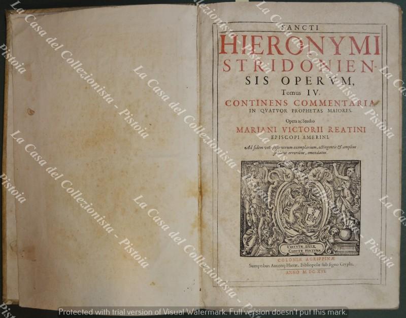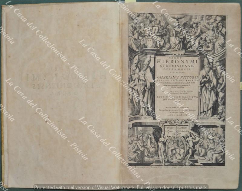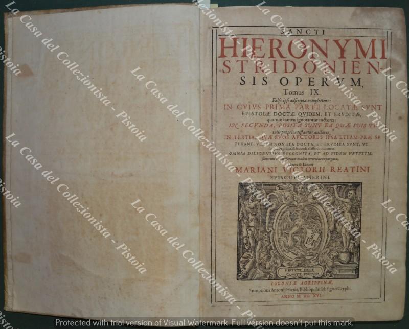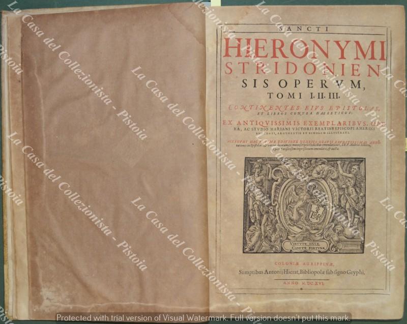 (Religione - rara ediz. ‘600) GERONIMO (San). SANCTI HIERONYMI STRIDONIENSIS OPERA OMNIA quae extant. MARIANI VICTORII REATINI EPISCOPI AMERINI labor & Studio ad fidem M. S. & vetusti. exemplarium emendata, argumentis & Scholiis illustrata. VITA ITEM S. HIERON. EX IPSIUS seriptis ad eodem Victor collecta. EDITIO NOVISSIMA, IN QUA qui accesserit, vide lector folio sequenti. COLONIAE AGRIPPINAE, Sumptibus ANTONII HIERAT, Bibliopolae subsinio Gryphi, 1616.
