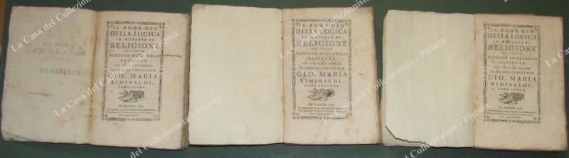(Religione – ediz. ‘700, Foligno) MUZZARELLI ALFONSO. IL BUON USO DELLA LOGICA IN MATERIA DI RELIGIONE. Dedicato all’emo e rmo Principe il Signor Cardinale Gio. Maria Rinaldi. Foligno, Giovanni Tomassini, 1787 (prima edizione). In 16° (cm 13x19), brossura muta coeva, in barbe. 3 volumi di pp. VIII + 288, pp. 370, pp. 363 + (1). Volumi solidi, qualche usura alle brossure, qualche ingiallimento. (Rif.D7806-700/72)