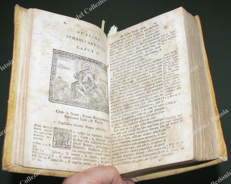 (Religione – illustr. ‘700) CATECHISMUS Ex Decreto SS. CONCILII TRIDENTINI AD PAROCHOS, PII. V. PONT. MAXIMI Jussu editus. Padova, Giovanni Manfrè, 1758. In 16° (cm 11x17), piega pergamena coeva con tassello impresso al dorso. Pp. (24) + 632 con numerose testatine, finalini, capilettera e, nel testo, 19 incisioni di mm 77x60. Conservazione buona eccetto diffusi ingiallimenti e qualche macchietta alla carta delle pagine. (Rif.D8066-629/72)