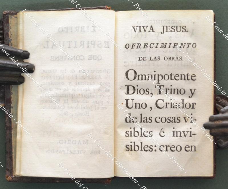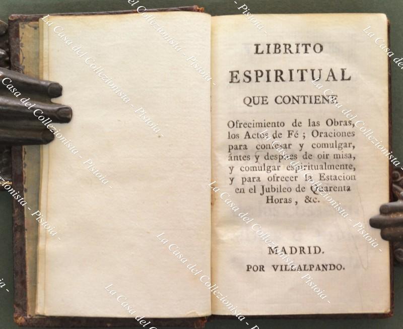 (Religione – legatura di pregio) LIBRITO ESPERITUAL. Que contiene Ofrecimiento de las Obras, los Actos de Fe’; Oraciones para confesar y comulgar… Madrid, Fermin Villapando, 1800 (circa).