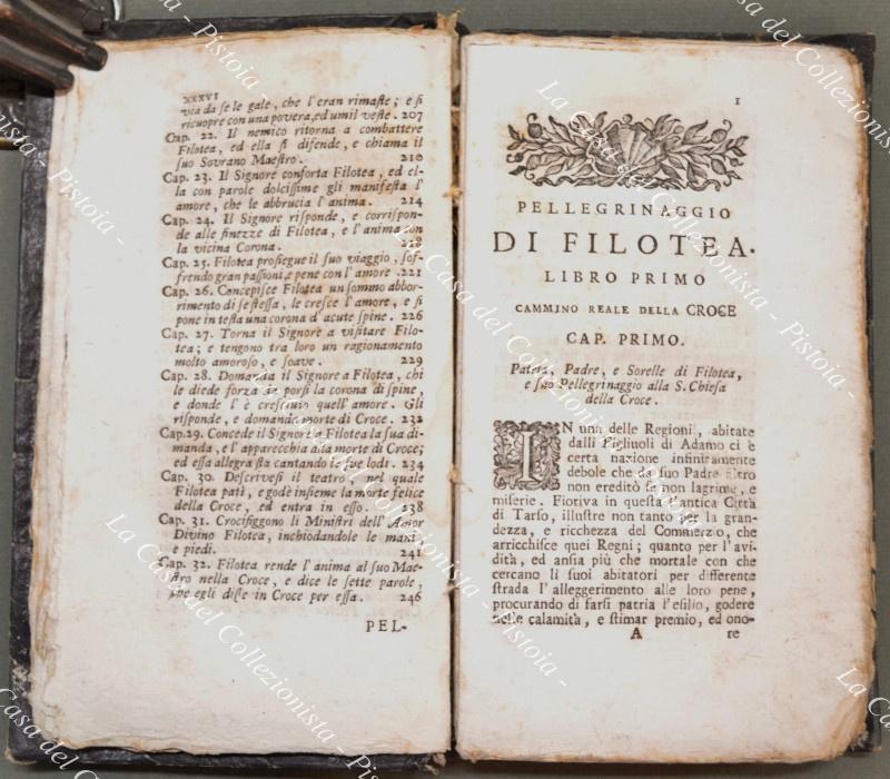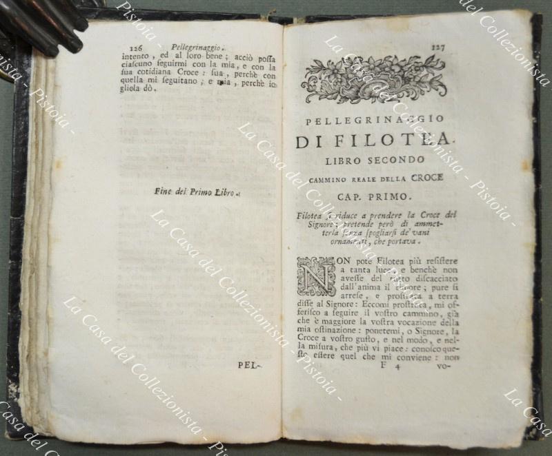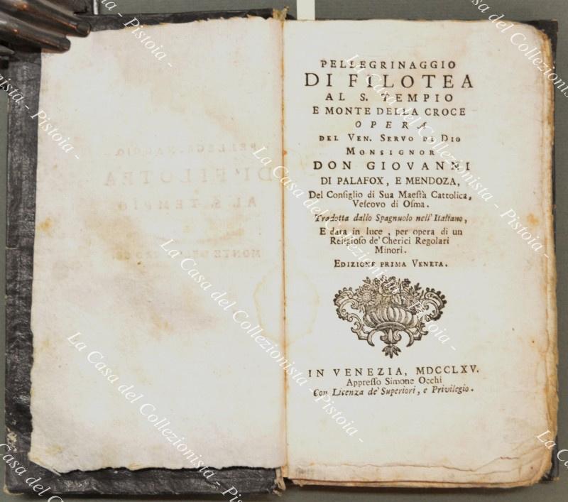 RELIGIONE, anno 1765. Don Giovanni di Palafox, e Mendoza. PELLEGRINAGGIO di FILOTEA AL S. TEMPIO E MONTE DELLA CROCE. Tradotta dallo Spagnuolo nell'Italiano, E data in luce, per opera di un Religioso de' Cherici Regolari Minori. Edizione prima veneta. Venezia, Simone Occhi, 1765.