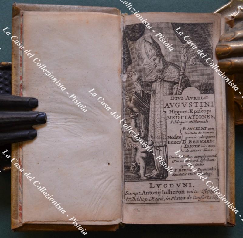 (Religione - elzeviriana - edizione 1669) AGOSTINO AURELIO (Santo). DIVI AURELII AUGUSTINI HIPPON. EPISCOPI MEDITATIONES, Soliloquia et Manuale ..... Lugduni, Sumpt. Antonij Iullieron, 1669. Cm 5x10.8, legatura coeva in piena pergamena. Pp. 374 + pp. 10 non numerate di indice (mancano le ultime 2); frontespizio inciso. Ottima conservazione. (Rif.F7245)