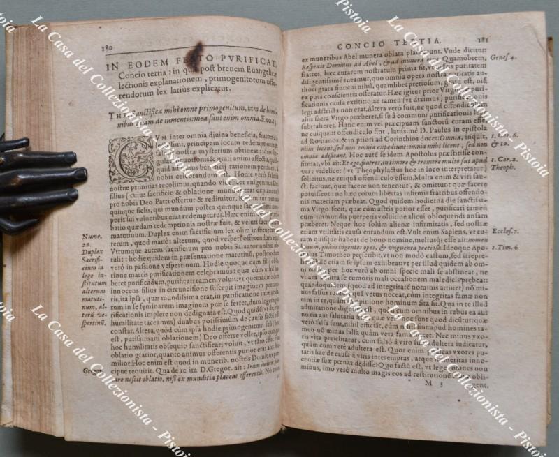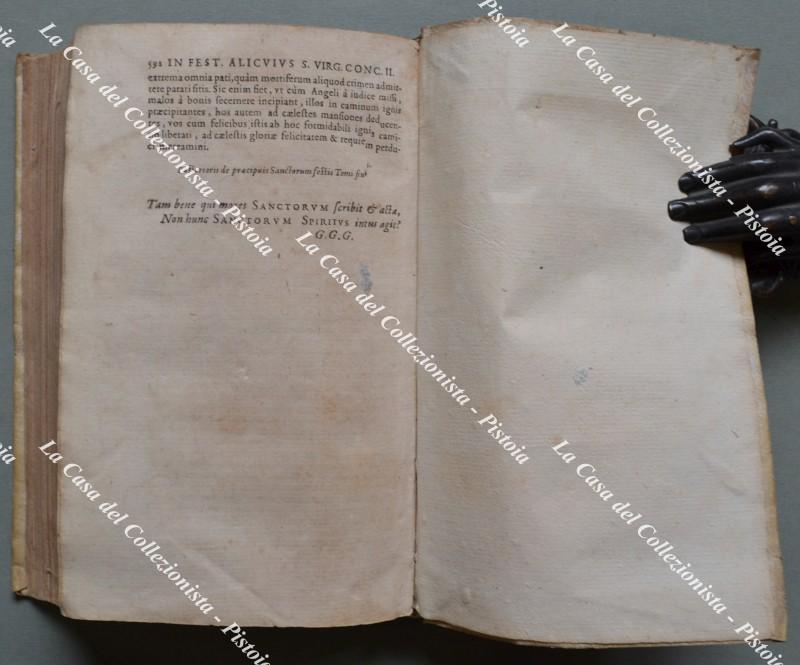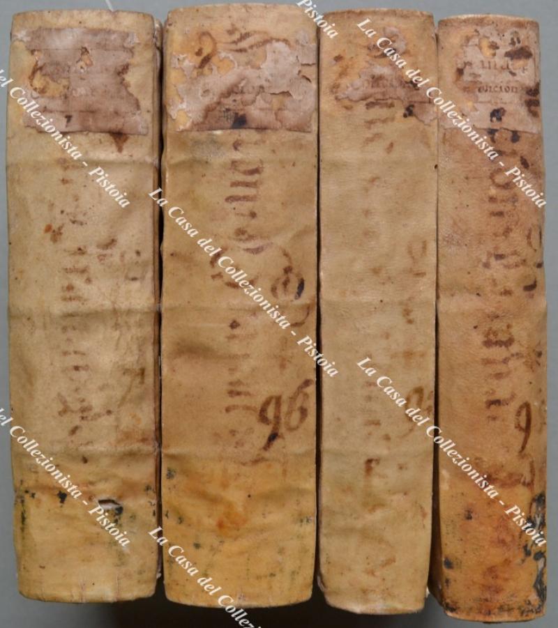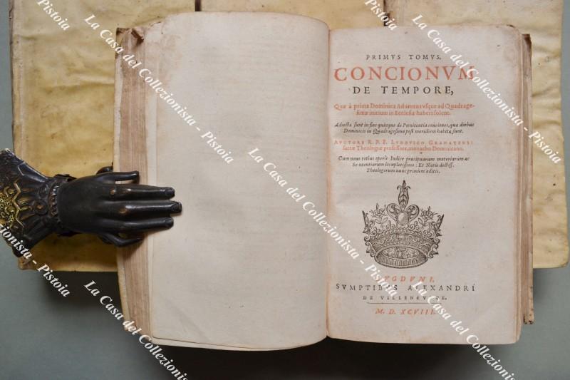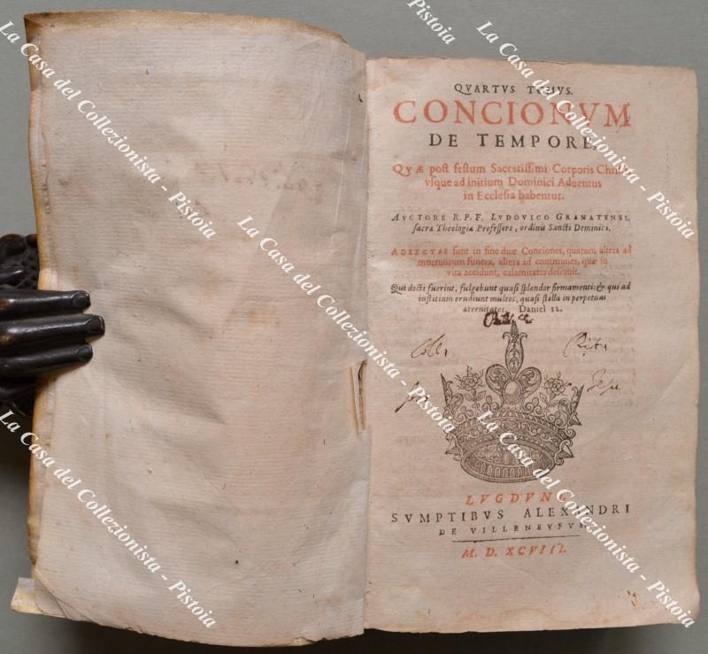 (Religione, Santi - ediz. ‘500) GRANADA LUIS DE. CONCIONES R.P. FR. LUDOVICI GRANATENSIS QUAE EXTANT, DE TEMPORE, ET SANCTIS IN SEX TOMOS DISTINCTAE: Quarum Ordinem & numerum secuientes paginae indicabunt. Cum novo totius indice praecipuarum materiarum & sententiarum amplissimo. Lugduni, Sumptibus Alexandri De Villeneufue, 1598. Cm 10.7x17.7, legature coeve in piena pergamena molle. Di questa rara opera disponiamo di 4 tomi su 6: Tomo I°) Pp. 190 non numerate di indice + pp. 573 + (1). *** Tomo IV°) Pp.774. *** Tomo V°) Pp. 576. *** Tomo VI°) Pp. 592. Frontespizi in rosso e nero. Legature in discreta conservazione con piccole usure. Presenti alcuni difetti: al primo volume segni d’umidità con lievi danni alle punte bianche superiori delle pagine dell’indice e ai margini esterni delle ultime, al secondo volume brunitura alla carta di alcune pagine con aloni, presenti antiche marginali annotazioni ad inchiostro nero (con alcune sbavature), manca al primo volume una uniziale carta bianca di guardia che però non fa parte del primo quaderno. (Rif.F5908-76)
