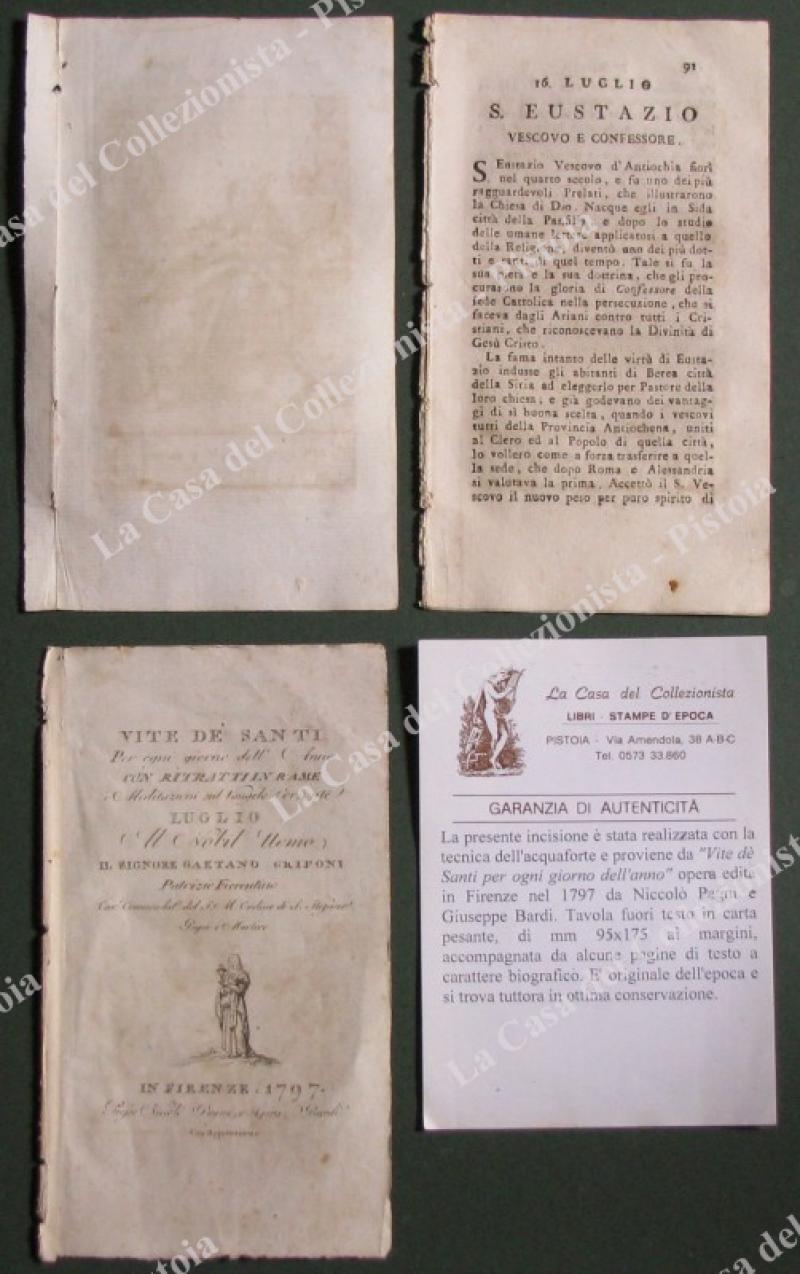 SAN BUSTAZIO. Fine incisione all'acquaforte di mm 70x120 (ai margini 95x175) tratta da "Vite de santi per ogni giorno dell'anno", opera edita in Firenze nel 1797 da Niccolò Pagni e Giuseppe Bardi. Unite alcune pagine biografiche. (Rif.E2789)