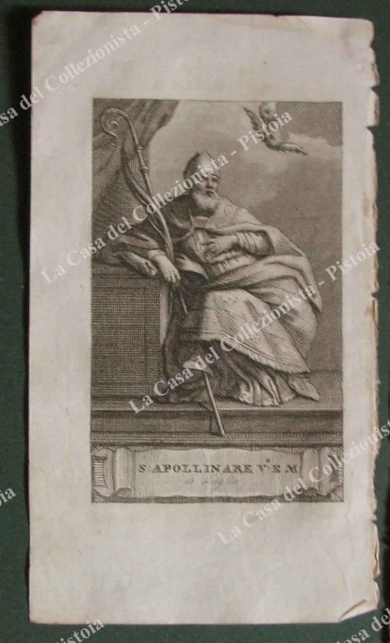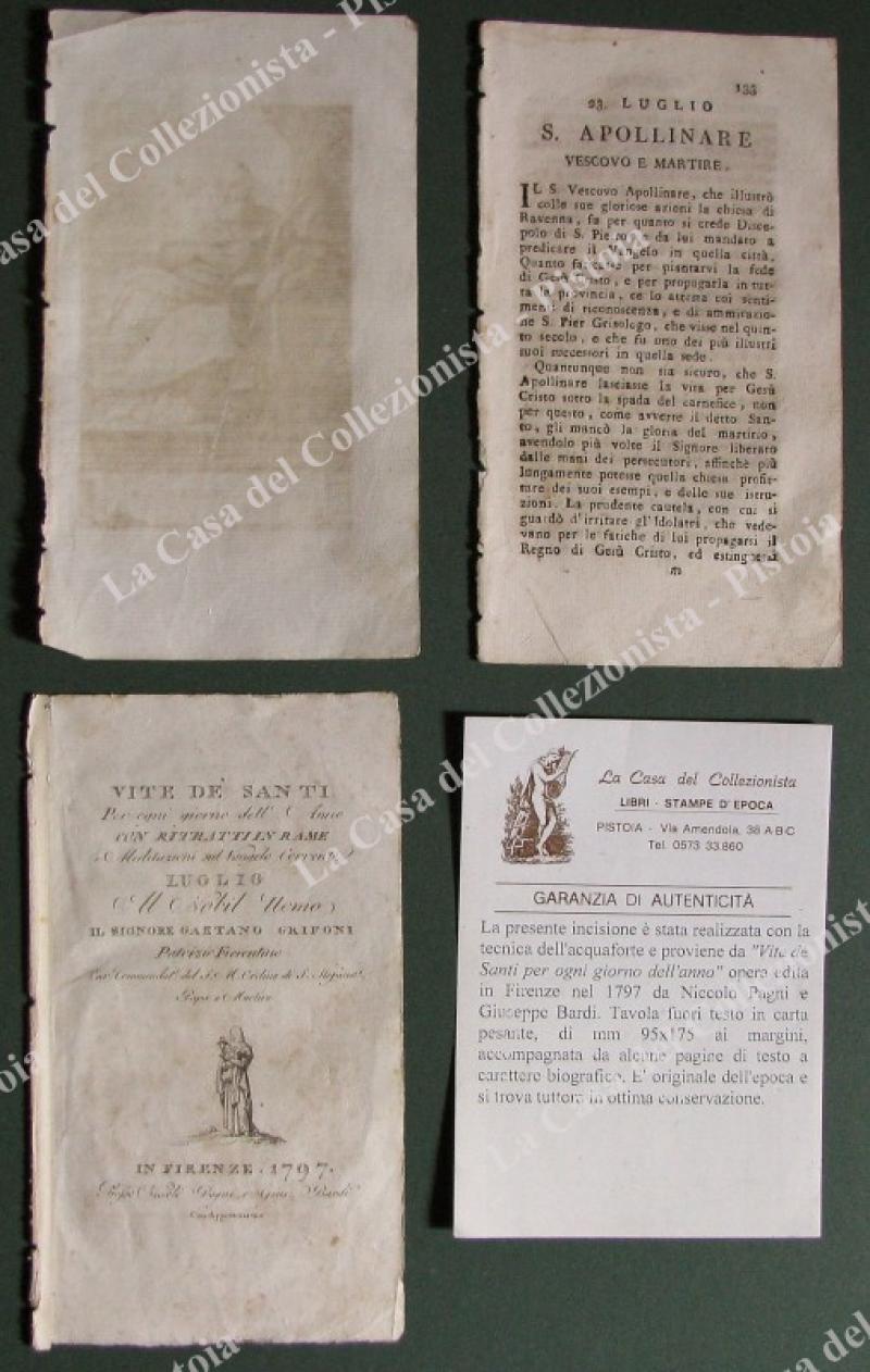 S.APOLLINARE. Fine incisione all'acquaforte di mm 70x120 (ai margini 95x175) tratta da "Vite de santi per ogni giorno dell'anno", opera edita in Firenze nel 1797 da Niccolò Pagni e Giuseppe Bardi. Unite alcune pagine biografiche. (Rif.E2814)