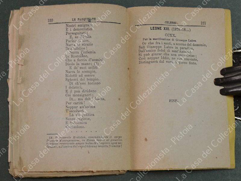 (Satira). LE PASQUINATE CELEBRI (1447 - 188...). Roma, Eredi del Barbagrigia, 1889. Cm 8,5x13, brossura originale, pagine 121. Lievi usure. (Rif.F7592)