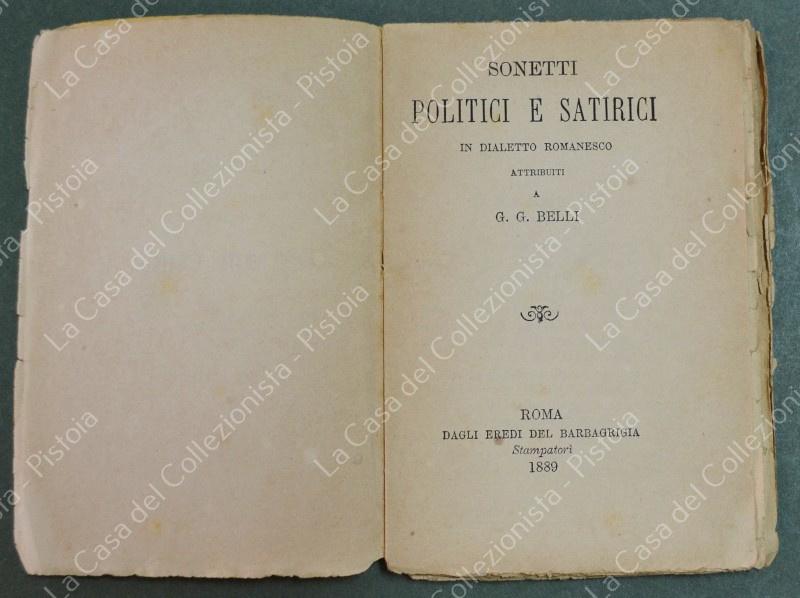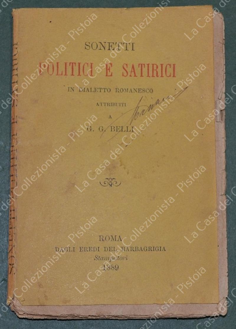 (Satira) SONETTI POLITICI E SATIRICI IN DIALETTO ROMANESCO. Attribuiti a G.G. Belli. Roma, Eredi del Barbagrigia, 1889. Cm 8,5x13, brossura originale, pagine 78. Minime usure. (Rif.F7593)