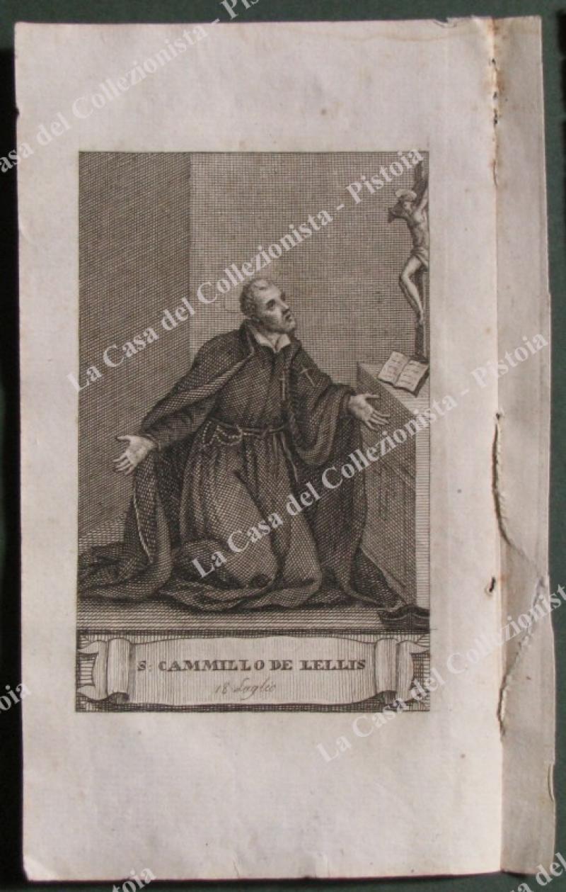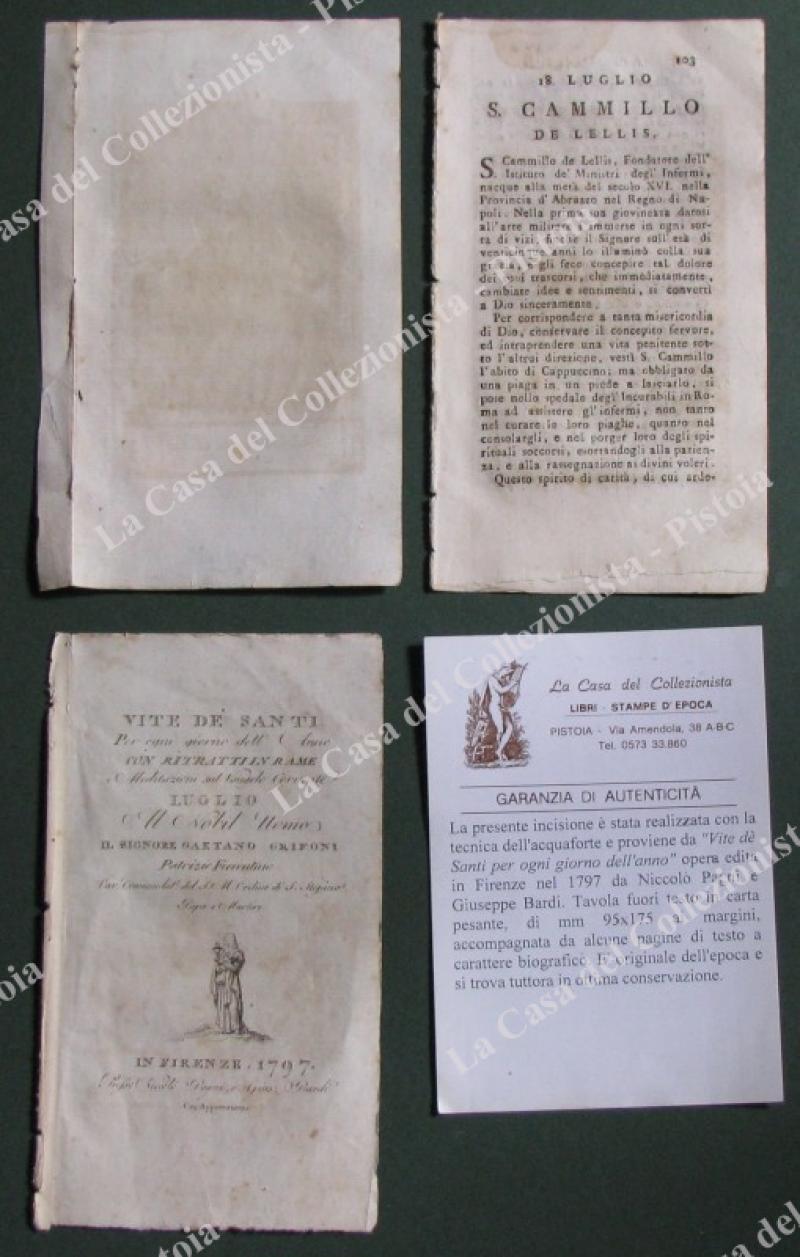 S.CAMILLO DE LELLIS. Fine incisione all'acquaforte di mm 70x120 (ai margini 95x175) tratta da "Vite de santi per ogni giorno dell'anno", opera edita in Firenze nel 1797 da Niccolò Pagni e Giuseppe Bardi. Unite alcune pagine biografiche. (Rif.E2793)