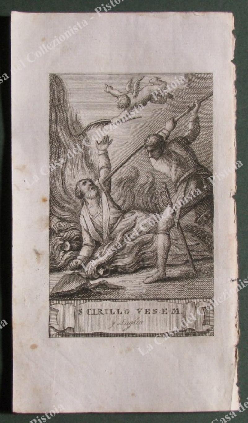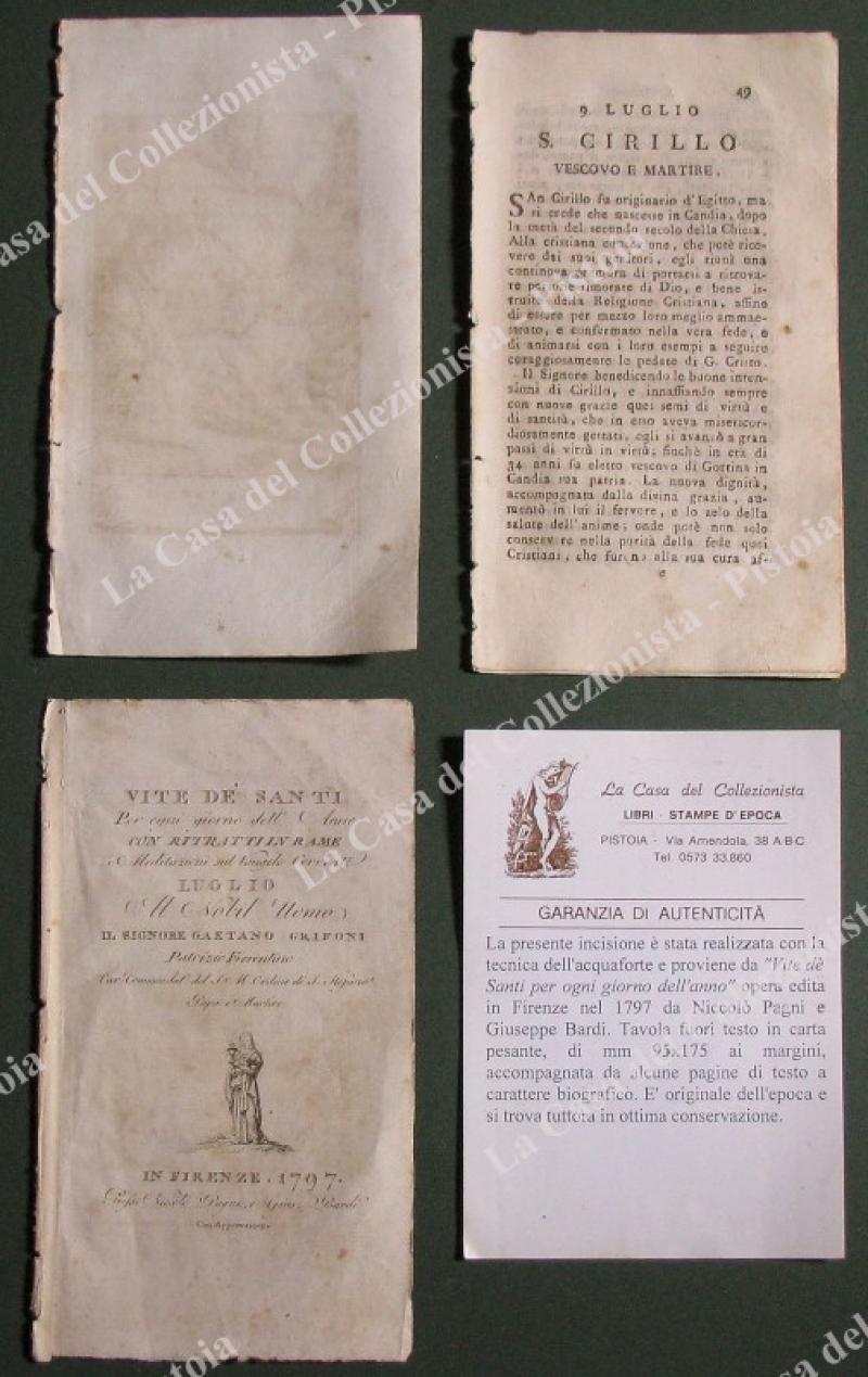 S.CIRILLO. Fine incisione all'acquaforte di mm 70x120 (ai margini 95x175) tratta da "Vite de santi per ogni giorno dell'anno", opera edita in Firenze nel 1797 da Niccolò Pagni e Giuseppe Bardi. Unite alcune pagine biografiche. (Rif.E2798)