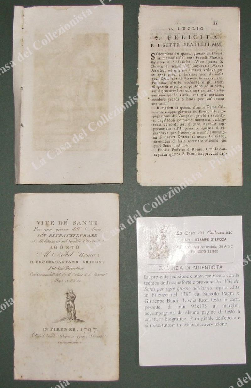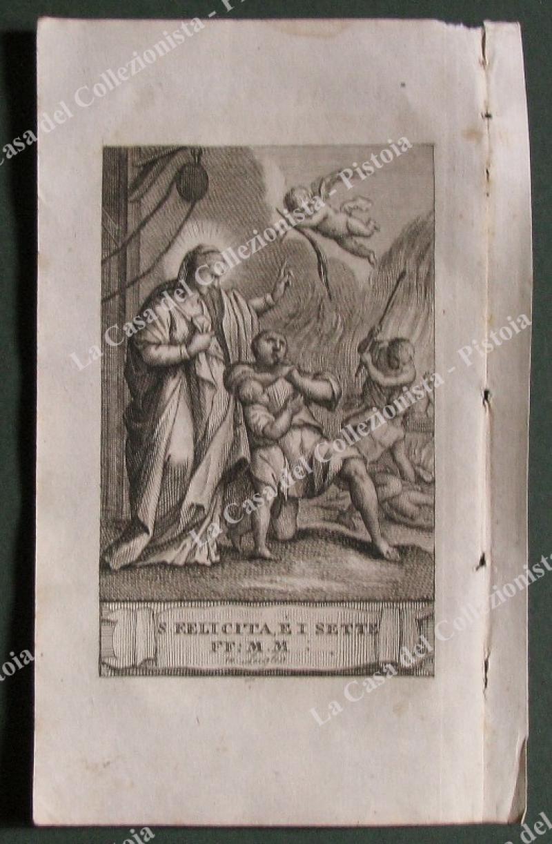 S.FELICITA E I SETTE. Fine incisione all'acquaforte di mm 70x120 (ai margini 95x175) tratta da "Vite de santi per ogni giorno dell'anno", opera edita in Firenze nel 1797 da Niccolò Pagni e Giuseppe Bardi. Unite alcune pagine biografiche. (Rif.E2797)