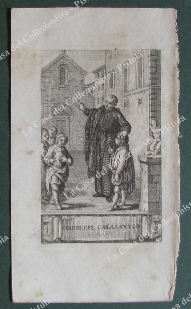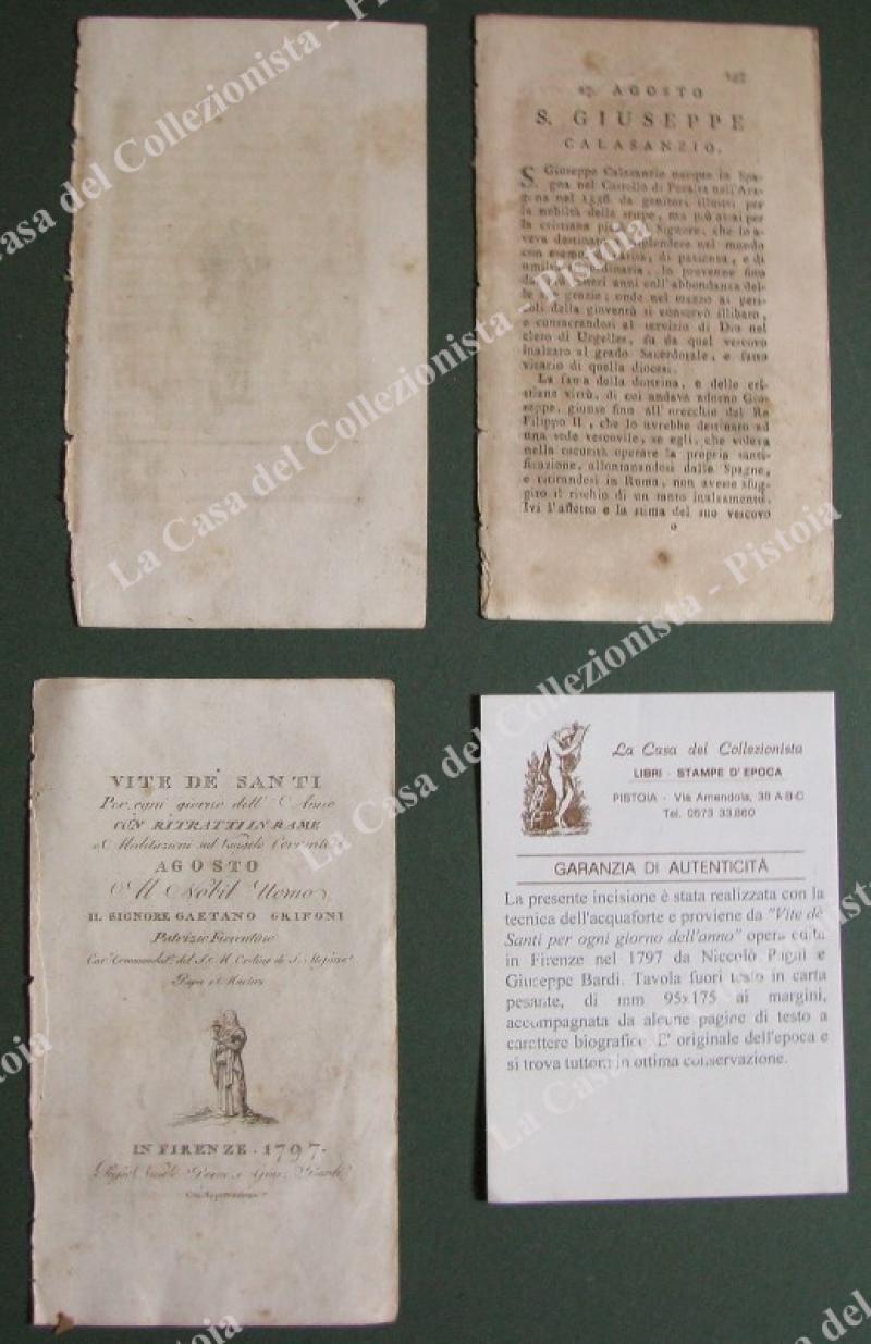 S.GIUSEPPE CALASANZIO. Fine incisione all'acquaforte di mm 70x120 (ai margini 95x175) tratta da "Vite de santi per ogni giorno dell'anno", opera edita in Firenze nel 1797 da Niccolò Pagni e Giuseppe Bardi. Unite alcune pagine biografiche. (Rif.E2804)