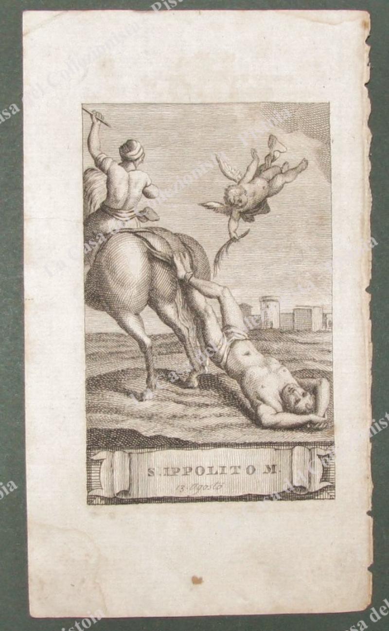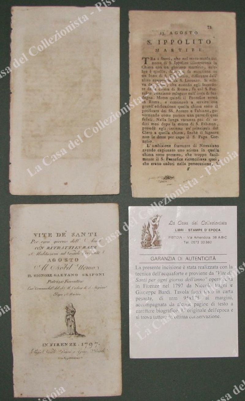 S.IPPOLITO. Fine incisione all'acquaforte di mm 70x120 (ai margini 95x175) tratta da "Vite de santi per ogni giorno dell'anno", opera edita in Firenze nel 1797 da Niccolò Pagni e Giuseppe Bardi. Unite alcune pagine biografiche. (Rif.E2811)