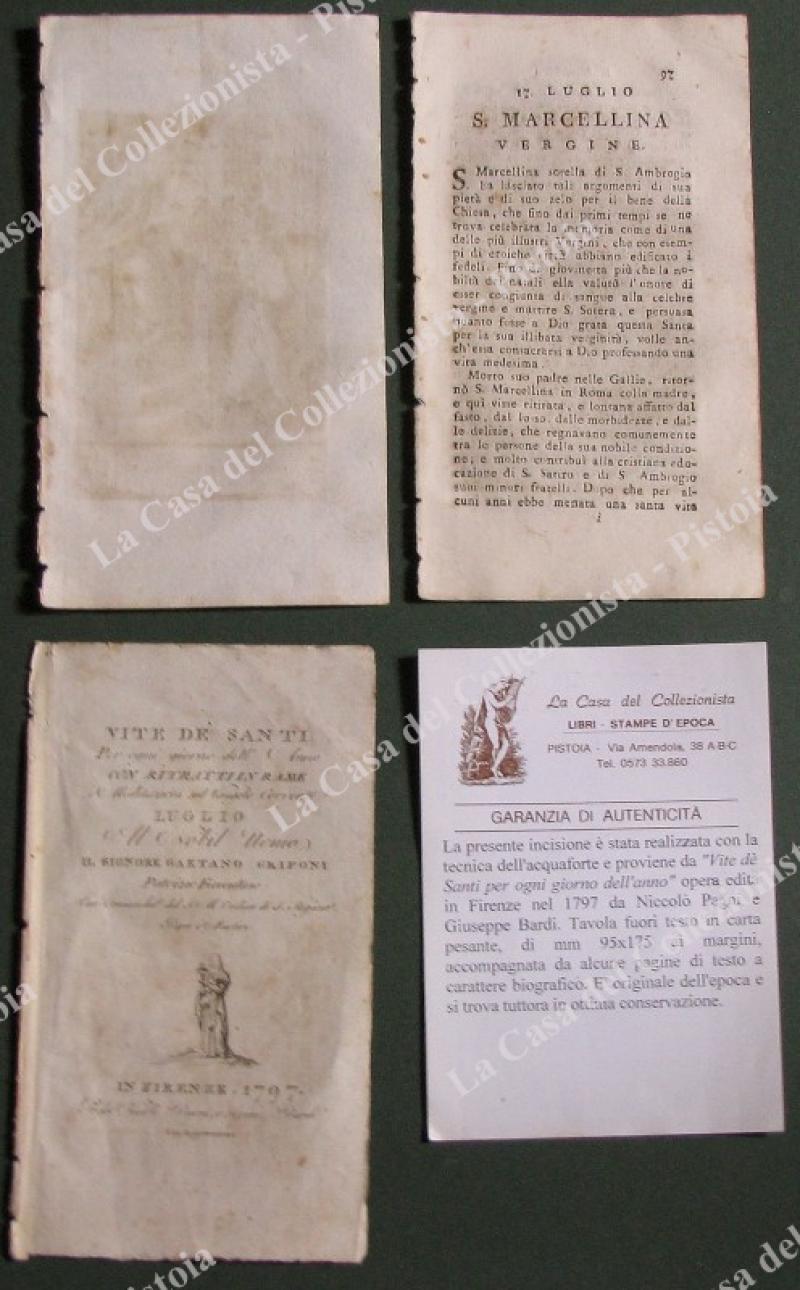 S.MARCELLINA. Fine incisione all'acquaforte di mm 70x120 (ai margini 95x175) tratta da "Vite de santi per ogni giorno dell'anno", opera edita in Firenze nel 1797 da Niccolò Pagni e Giuseppe Bardi. Unite alcune pagine biografiche. (Rif.E2794)