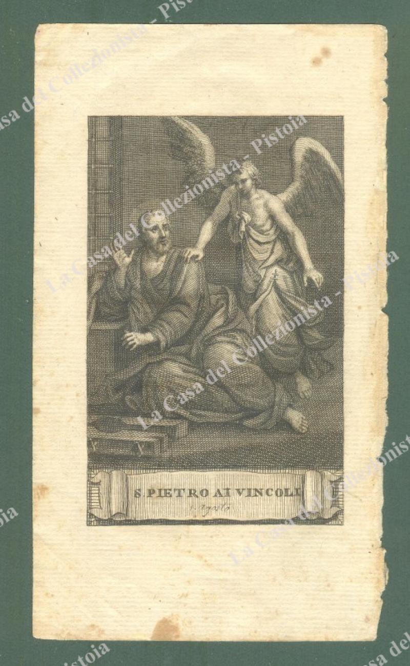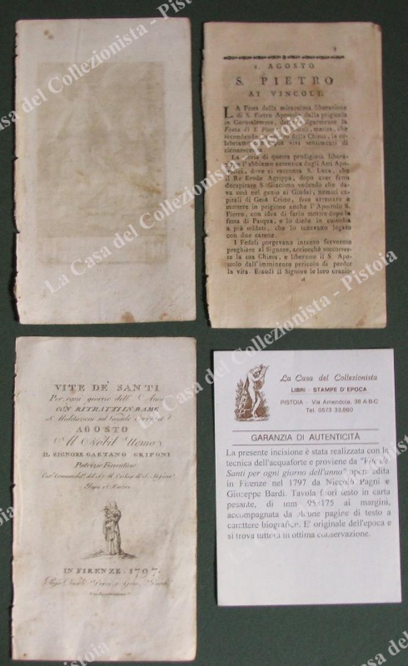 S.PIETRO AI VINCOLI. Fine incisione all'acquaforte di mm 70x120 (ai margini 95x175) tratta da "Vite de santi per ogni giorno dell'anno", opera edita in Firenze nel 1797 da Niccolò Pagni e Giuseppe Bardi. Unite alcune pagine biografiche. (Rif.E2817)