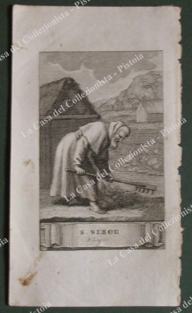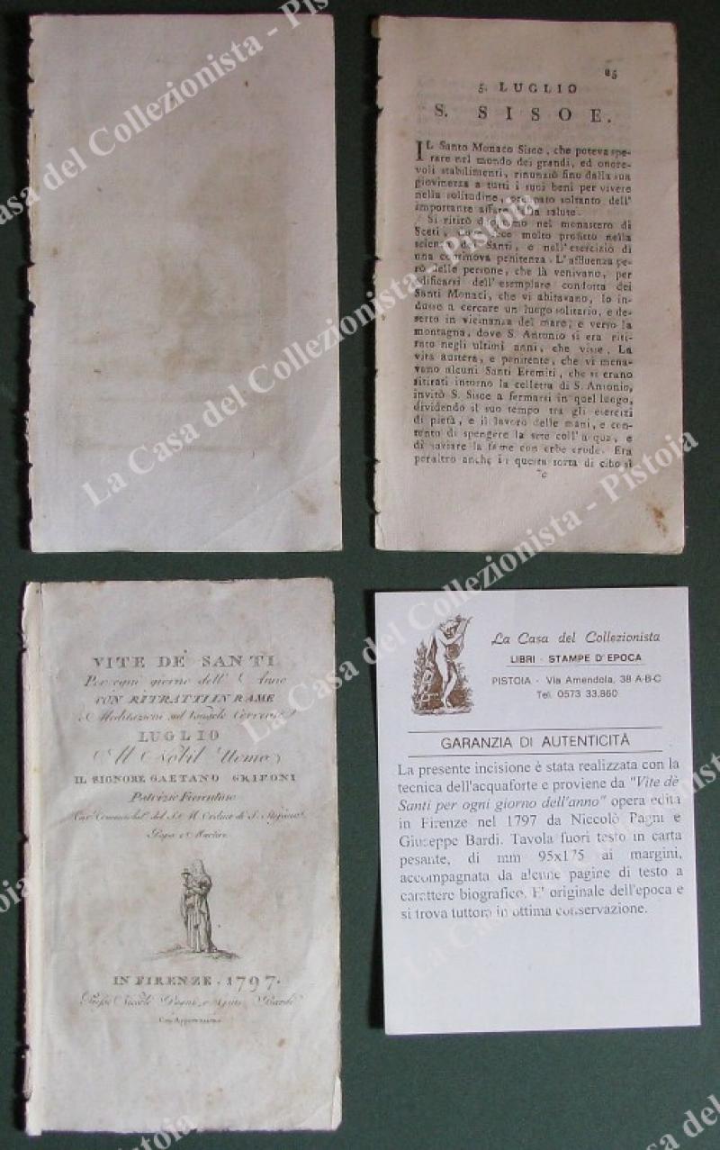 S.SISOE. Fine incisione all'acquaforte di mm 70x120 (ai margini 95x175) tratta da "Vite de santi per ogni giorno dell'anno", opera edita in Firenze nel 1797 da Niccolò Pagni e Giuseppe Bardi. Unite alcune pagine biografiche. (Rif.E2801)