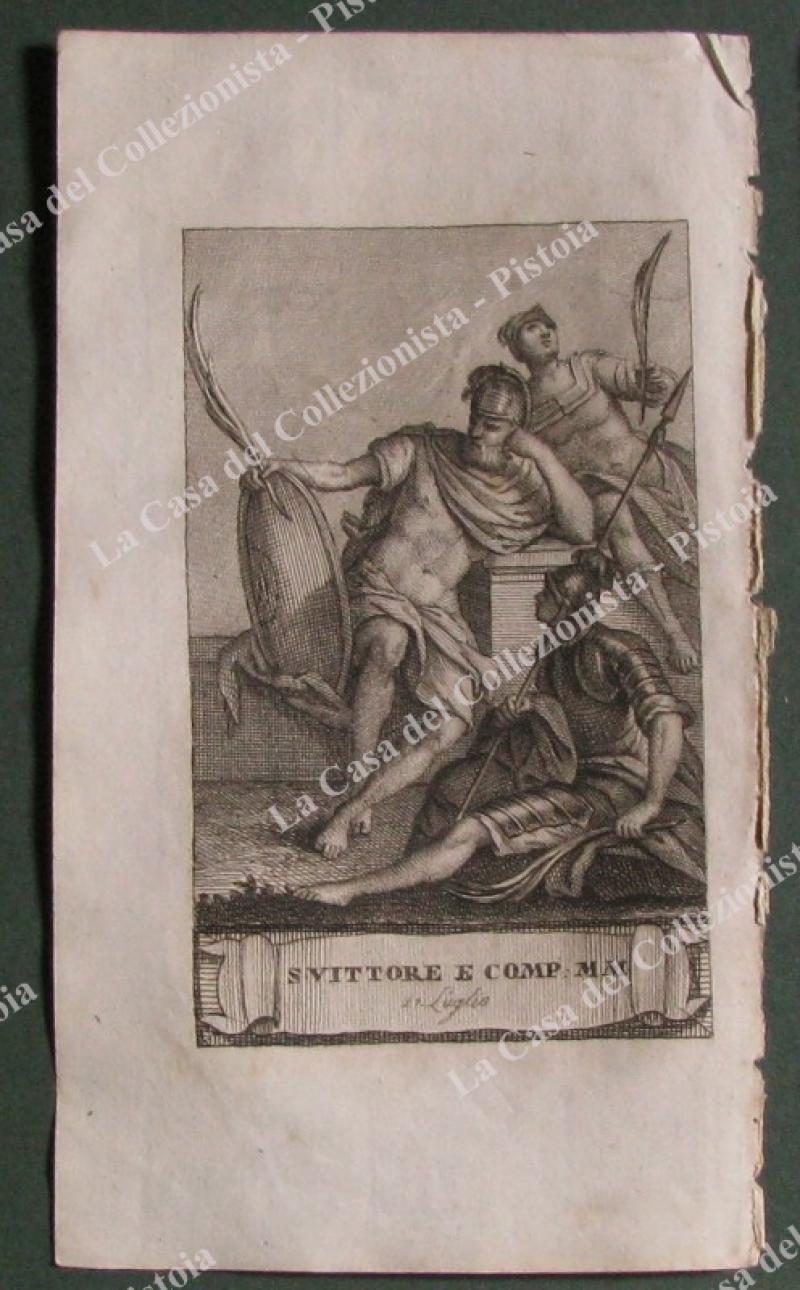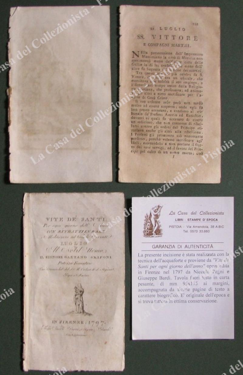 S.VITTORE. Fine incisione all'acquaforte di mm 70x120 (ai margini 95x175) tratta da "Vite de santi per ogni giorno dell'anno", opera edita in Firenze nel 1797 da Niccolò Pagni e Giuseppe Bardi. Unite alcune pagine biografiche. (Rif.E2791)