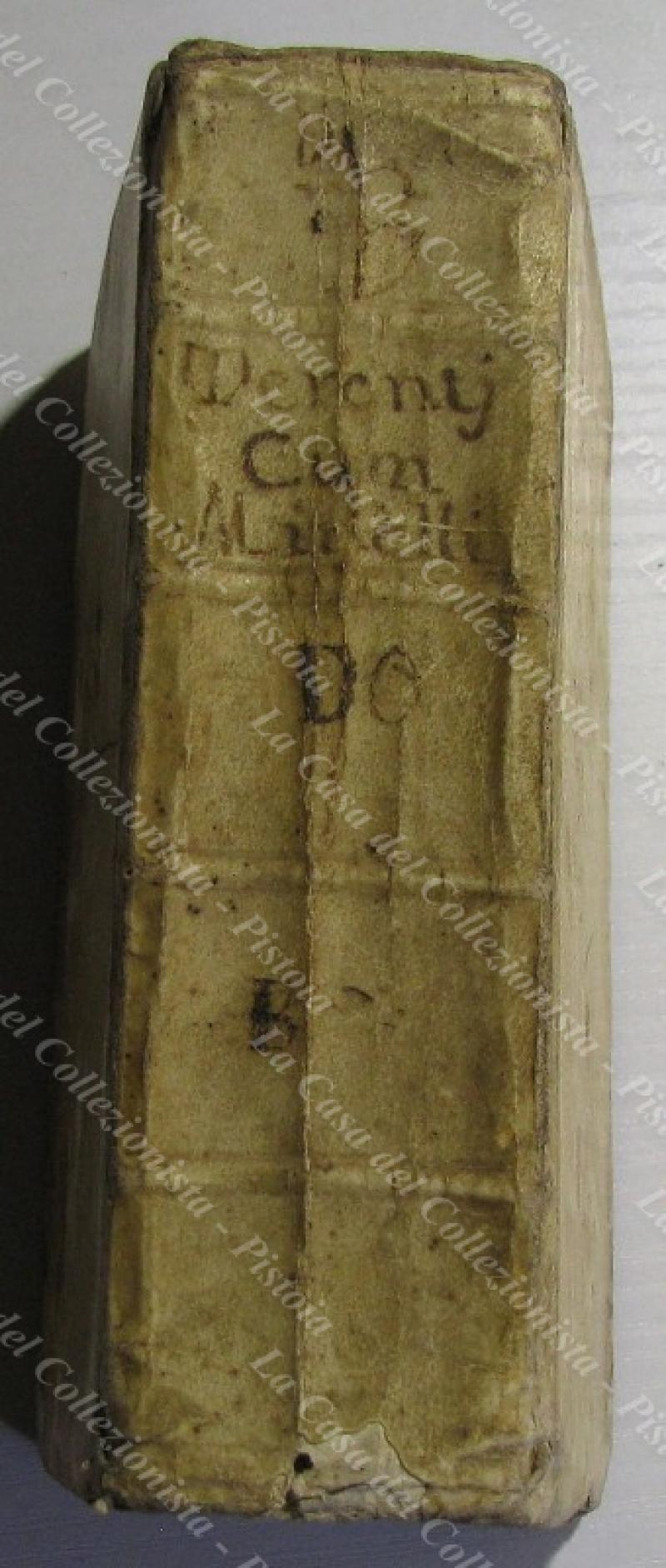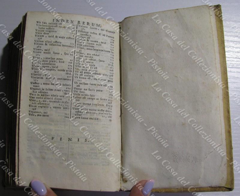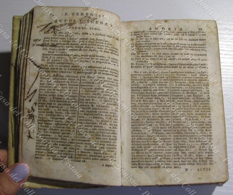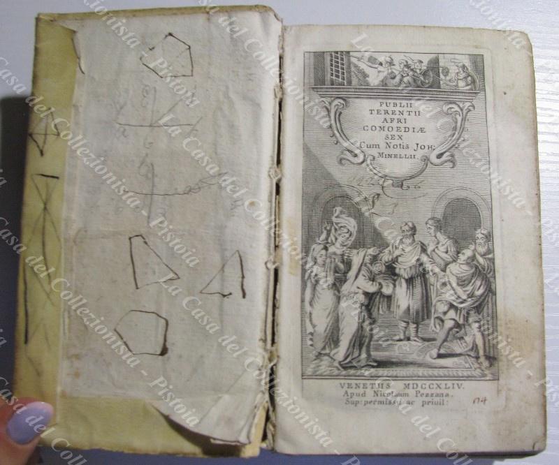 (Teatro – ediz. ‘700) PUBLIO TERENZIO AFRO. PUBLII TERENTII AFRI COMOEDIAE SEX CUM NOTIS I.OH MINELII. Venezia, Nicola Pezzana, 1764. Cm 9x15, legatura coeva in piena pergamena con titolo manoscritto al dorso. Pp. (12) + 540 + (36). Frontespizio allegorico inciso. Volume ancora solido, ma con qualche accettabile difetto alla pergamena; qualche macchia d’inchiostro e scarabocchio ad alcune pagine. (Rif.D9931-545/73)