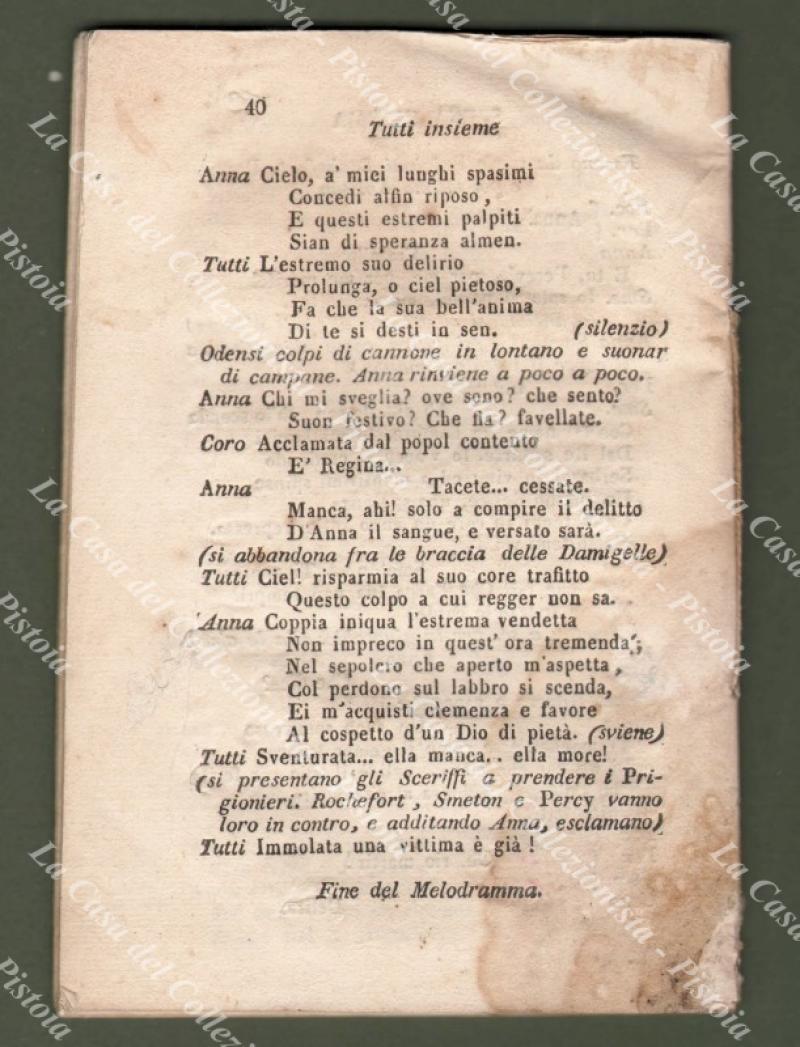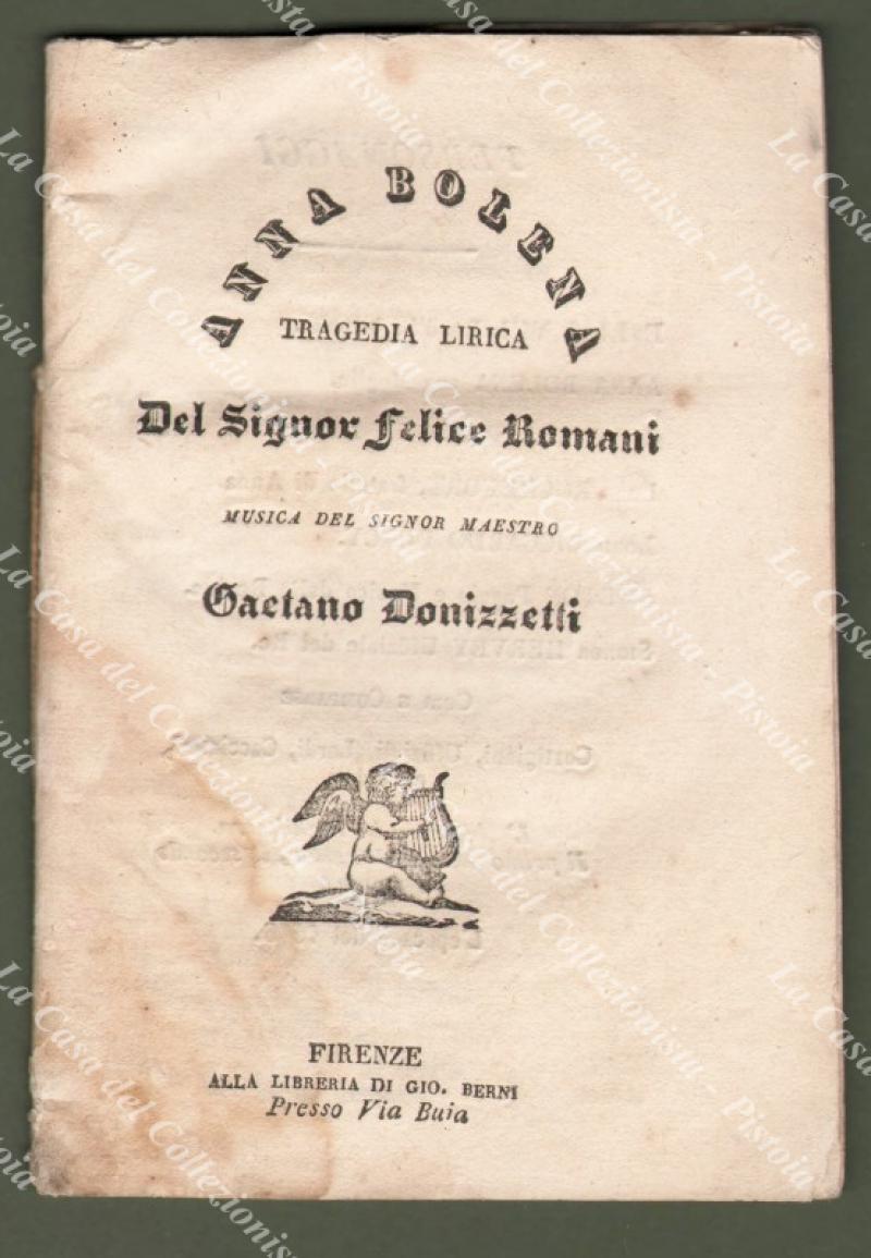 Teatro '800 - Firenze. ANNA BOLENA tragedia lirica del Signor FELICE ROMANI musica del Maestro GAETANO DONIZZETTI. Firenze, Gio. Berni Presso Via Buia. Cm 10x15, pagine 40, senza copertina. Alone d'umidità alle pagine. (Rif.F1787)