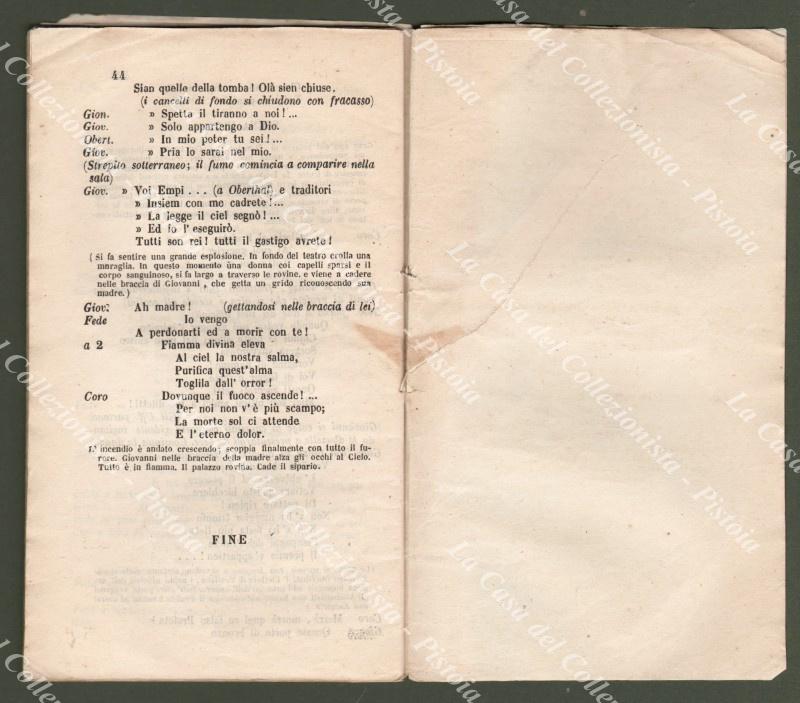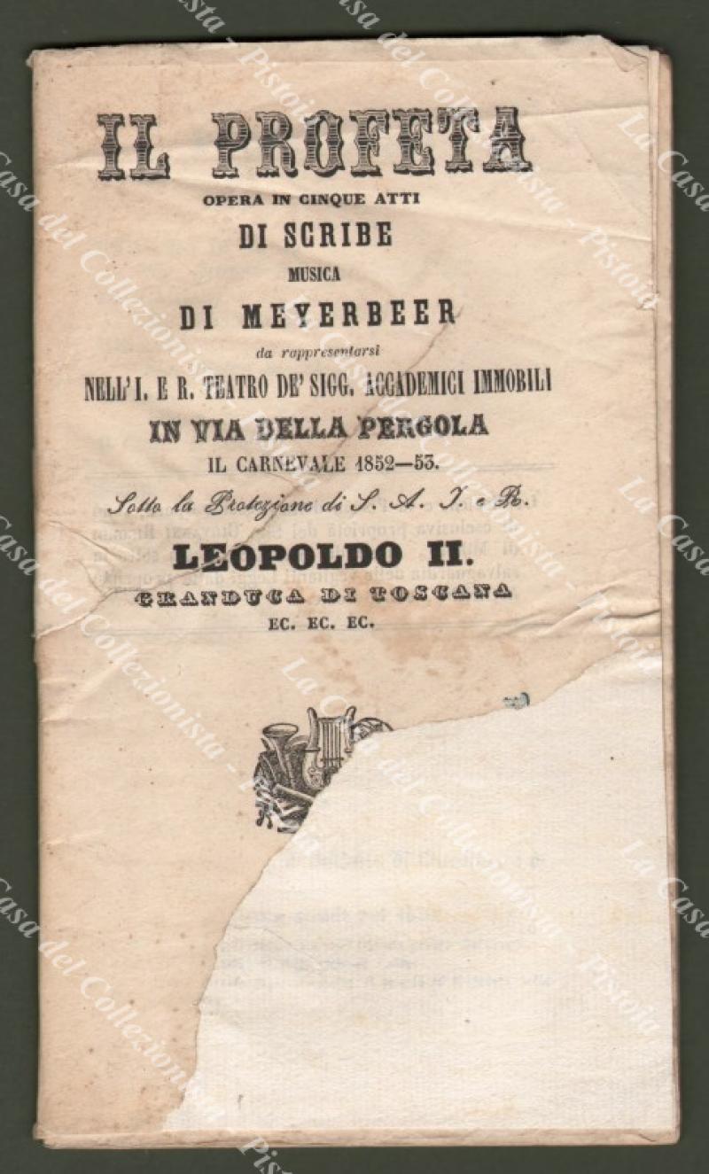 Teatro '800 - Firenze. IL PROFETA opera in cinque atti di SCRIBE musica di MEYERBBER da rappresentarsi nell'I. e R. Teatro de' Sigg. Accademici Immobili in via della Pergola il carnevale 1852-53. Cm 11x19,50, senza copertona, pagine 44 + 2 bianche. Mancanza di carta, reintegrata, alla prima pagina e lievi usure. (Rif.F1793)