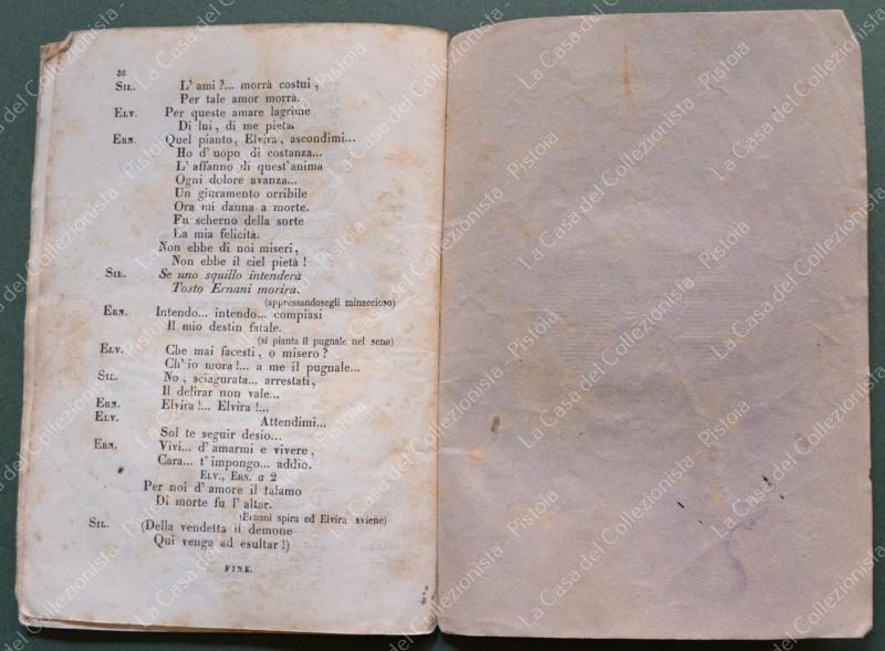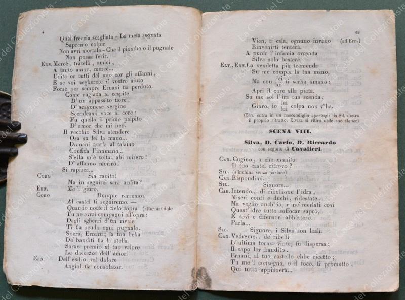 (Teatro) ERNANI. Dramma lirico in quattro parti di Francesco Maria Piave posto in musica da Giuseppe Verdi. Milano,Giovanni Ricordi, 1845. Cm 11,5x16,5, brossura originale tipografica, pagine 36. Ingiallimenti e lievi difetti. Raro. (Rif.F6766)