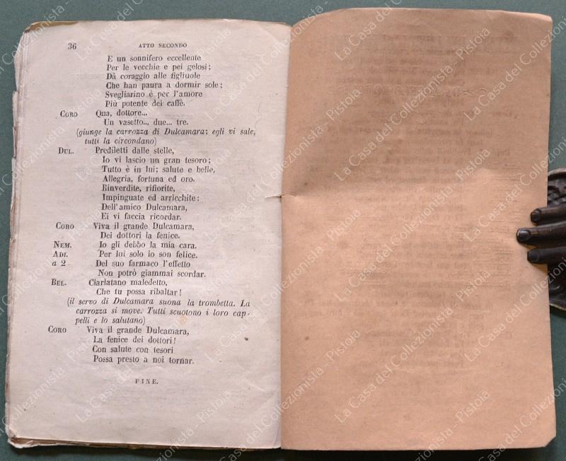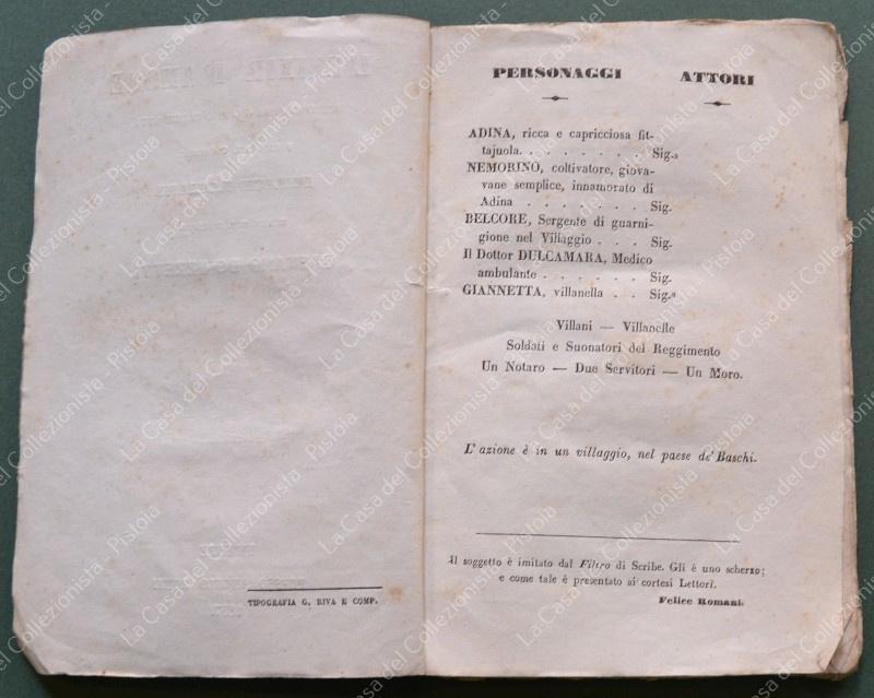 (Teatro) L'ELIXIR D'AMORE. Melodramma giocoso in due atti. Poesia del cavalieri Felice Romani. Musica del maestro Gaetano Donizzetti. Firenze, presso Angelo Romei, 1857. Cm 11x17, brossura editoriale, pagine 36. Lievi usure per lo più al dorso. (Rif.F6762)