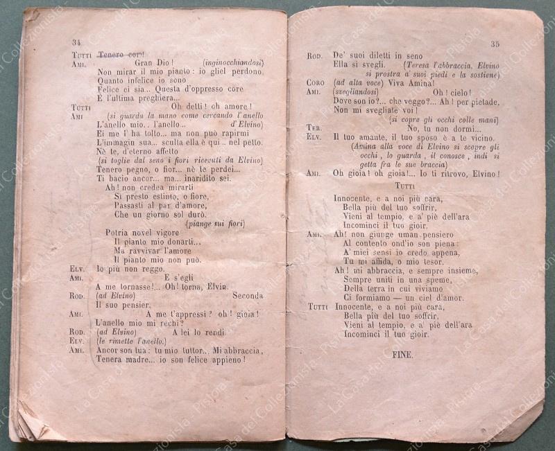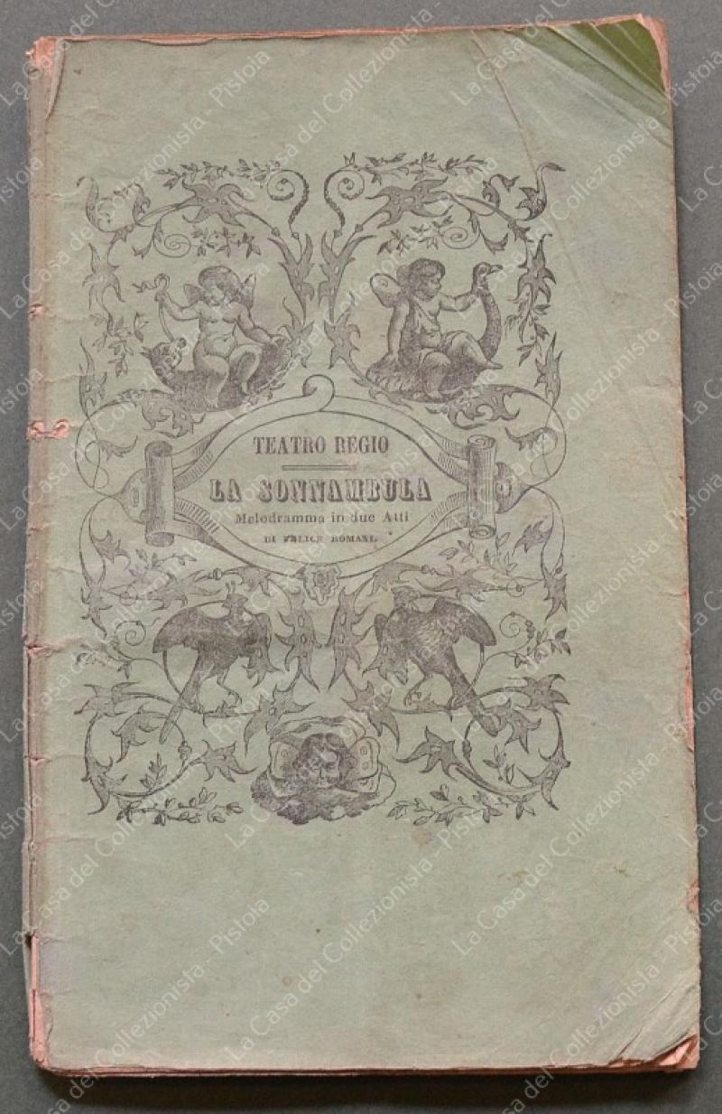 (Teatro) LA SONNAMBULA. Melodramma in due atti di Felice Romani. Posto in musica da Vincenzo Bellini. Da rappresentarsi al Teatro Regio nel Carneval - Quaresima 1856 - 57. Torino, F.lli Fodratti, 1856. Cm 10,5x17, brossura originale tipografica, pagine 35 + 1 bianca. Varie annotazioni a matita. Varie accettabili usure. (Rif.F6759)
