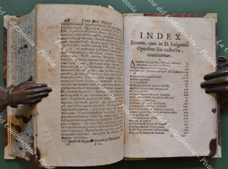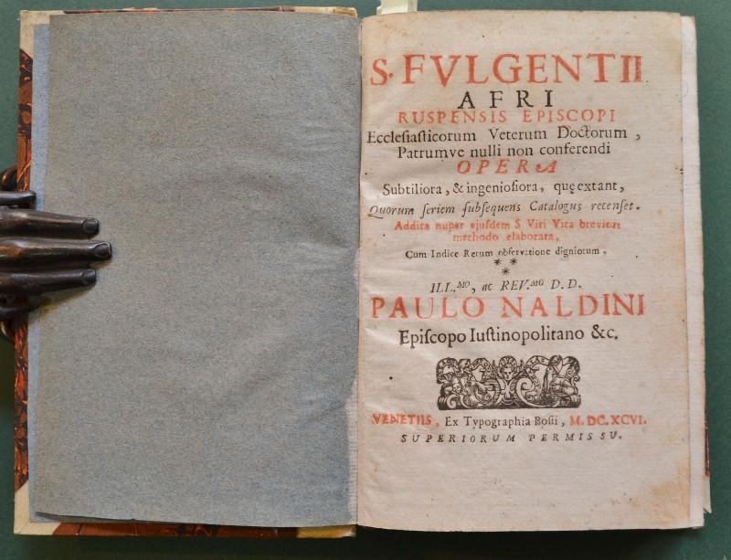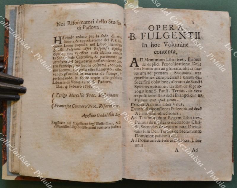 Teologia - Ediz. '600. FULGENZIO SANTO. S. FULGENTII AFRI RUSPENSIS EPISCOPI. Ecclesiastocorum Veterum Doctorum, Patrumve nulli non conferendi OPERA. Venezia, Antonio Bosio, 1696. Cm 10.4x16, mezza pergamena ottocentesca con tassello al dorso. Pp. (24) + pp. 496 + pp. 16. Opera controllata e completa. Il volume contiene presentazione di Bernardo Borghi, la vita del santo e le seguenti opere: 1) Ad Monimum Libri. 2) Contra Arainos. 3) Decem Responsiones Fulgentii. 4) Ad Tresimundum Regem. 5) Ad Donatum de Fide orthodoxa. 6) Ad Felicem Notarium de Trinitate. 7) Addiversos Epistole. 8) Ad Populum Sermones. Volume solido e ben conservato eccetto per la presenza di macchie d'inchiostro sul taglio e sui margini bianchi di alcune pagine. (Rif.F4282)