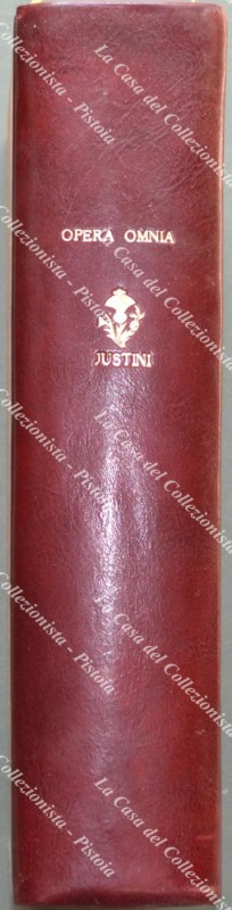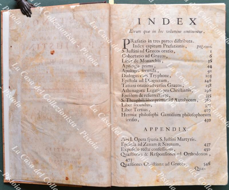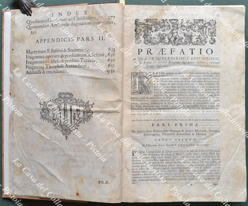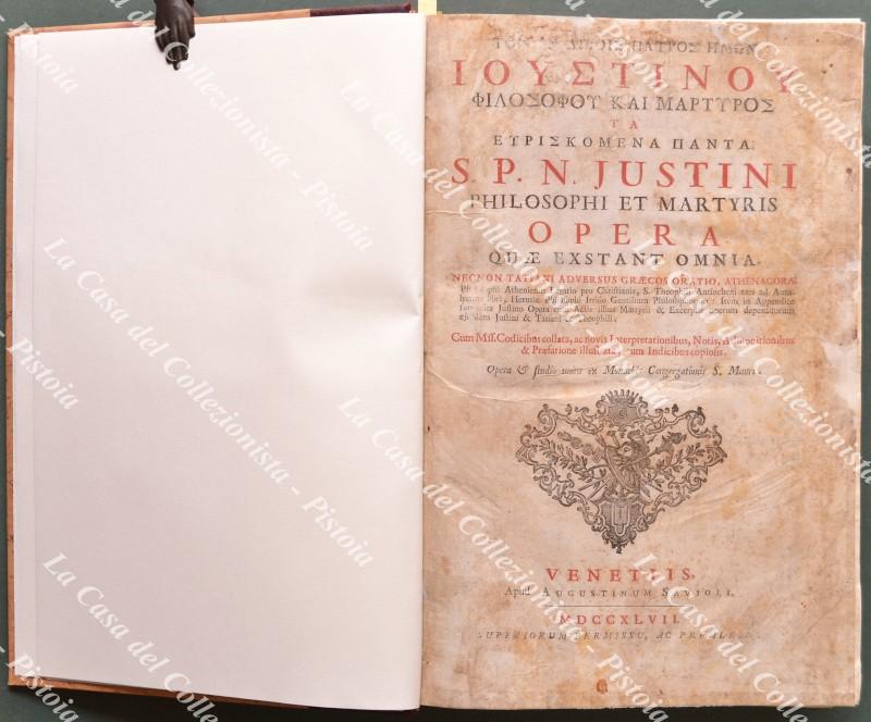(Teologia, filosofia - ediz. ‘700) JUSTINUS (Santo) S.P.N. JUSTINI PHILOSOPHI ET MARTYRIS OPERA QUAE EXSTANT OMNIA... Venezia, Agostino Savioli, 1747. Cm 23x35,5, elegante mezza pelle recente con titolo in oro al dorso. Pp. (4) + CXX + 688 + XL. Testo in greco e latino su 2 colonne, frontespizio in rosso e nero con vignetta incisa. Opera collazionata e completa ma con difetti: frontespizio un poco sporco e con restauri laterali (senza perdite); aloncini, ingiallimenti e macchiette d’umidità diffuse ma non pesanti; ultime tre carte con restauri (senza perdite e un poco sporche). (Rif.F0622-74)
