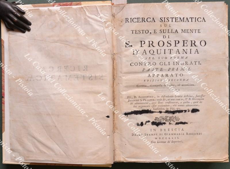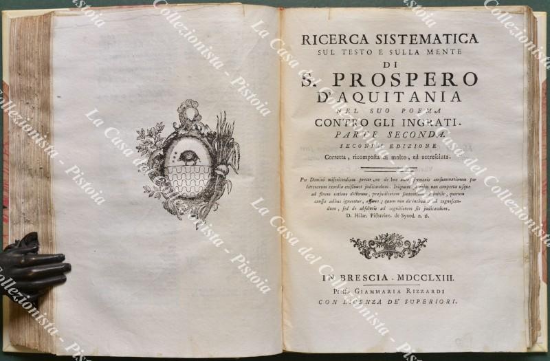 (Teologia, Giansenismo - ediz. ‘700). VIATORE DA COCCAGLIO. RICERCA SISTEMATICA SUL TESTO, E SULLA MENTE DI S. PROSPERO D’AQUITANIA NEL SUO POEMA CONTRO GLI INGRATI. Edizione seconda, corretta, ricomposta di molto, ed accresciuta.