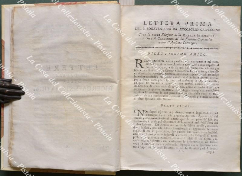 (Teologia, Giansenismo - ediz. ‘700). VIATORE DA COCCAGLIO. RICERCA SISTEMATICA SUL TESTO, E SULLA MENTE DI S. PROSPERO D’AQUITANIA NEL SUO POEMA CONTRO GLI INGRATI. Edizione seconda, corretta, ricomposta di molto, ed accresciuta. Brescia, Gianmaria Rizzardi, 1762-1763. Cm 19x26, legatura novecentesca in mezza pergamena con punte, titolo e nervi al dorso e piatti marmorizzati. Unico volume contenente due parti: 1) Pp. XX + 365. 2) Pp. XVI + 520. Opera completa. Legatura solida, interno con alcuni difetti: occhietto e frontespizio della prima parte con uno strappo ricomposto e una antica firma cancellata, ultima carta della seconda parte con vistosi restauri marginali (senza perdite di testo), altre lievi piccole mende. (Rif.F0633-74)