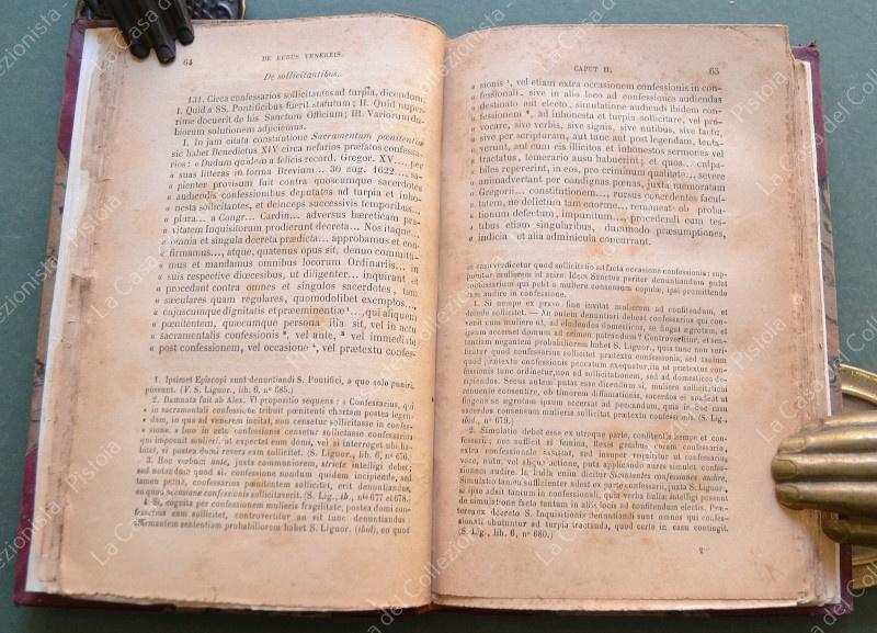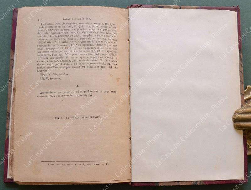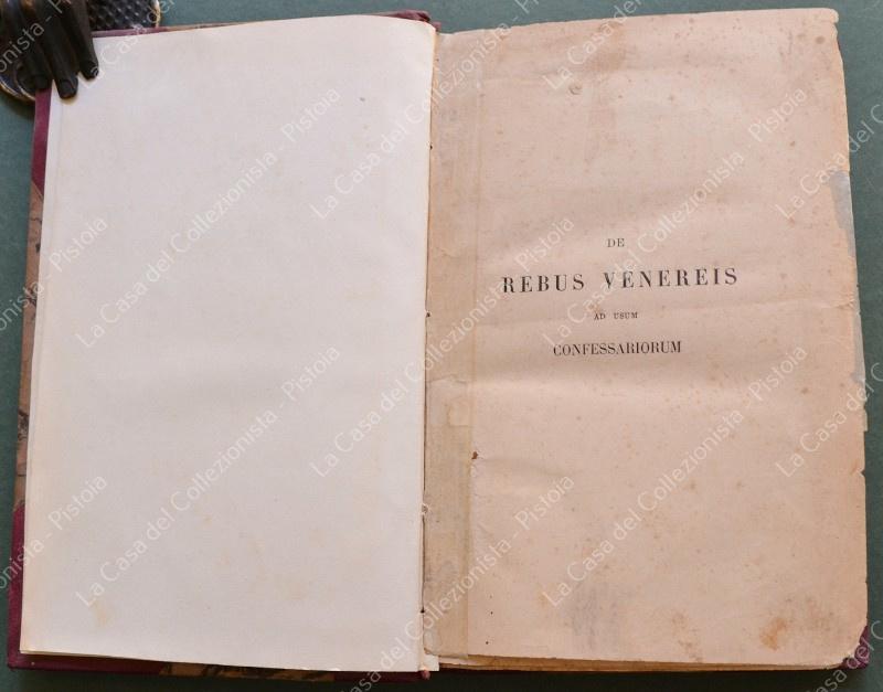 Teologia morale - sesso. CRAISSON D.. DE REBUS VENEREIS AD USUM CONFESSARIORUM. Editio nova. Parigi, Poussielgue Fratres, 1888. Cm 12x18, mezza pelle coeva con punte e piatti in carta decorata. Pagine VI + 244. In barbe. L'opera destinata ai confessori cattolici, esplora in modo approfondito la moralità sessuale, offrendo linee guida riguardo ai peccati e comportamenti legati alla sfera "venerea". Volume solido e ben conservato eccetto piccole fessurazioni al dorso e lievi danni restaurati al frontespizio. (Rif.F8173)