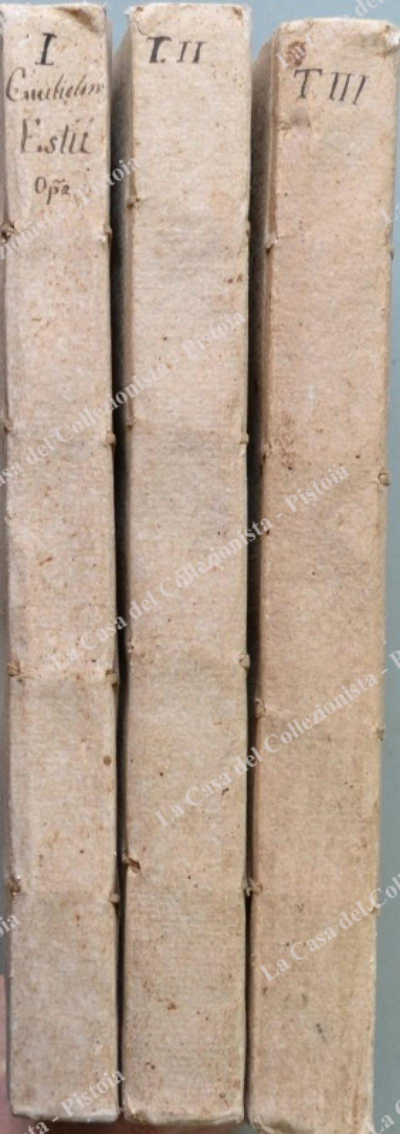 (Teologia, Sacre Scritture – ediz. ‘700) ESTIO GUGLIELMO. IN SACFRAM SCRIPTURAM OPERA OMNIA TRIBUS TOMIS DISTRIBUITA. Quorum duo primi in omnes B. Pauli, & Septem Catholicas Apostolorum Espisolas Commentaria continent; Tertius vero in Loca Praecipua & Difficiliora Scripturae Adnotationes complectitur… EDITIO PRIMA VENETA. Venezia, Niccolò Pezzana, 1759. In folio (cm 26,5x40), cartonature coeve alla rustica con titolo manoscritto ai dorsi. Tre volumi di pp. (8) + 411 + (1), pp. 413-923 + (1), pp. (4) + 448 + XCVII + (1). I primi due volumi hanno paginazione continua. Frontespizio del primo volume in rosso e nero, marca tipografica sui tre frontespizi. Opera collazionata e completa, in barbe. Stato di conservazione buono eccetto frequenti fioriture più marcate in alcune pagine. Estio (1542 – 1613) fu esegeta e teologo cattolico, noto per i commentari acuti ed eruditi alle lettere di S. Paolo e alle epistole cattoliche. Questa è la sua opera più famosa. (Rif.D6527-605/70)
