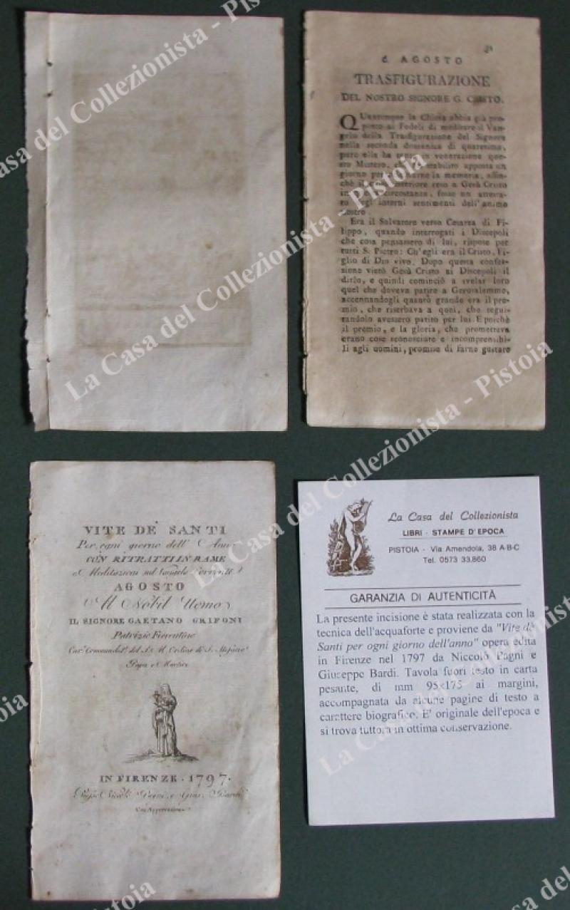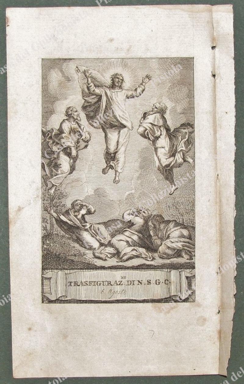 TRASFIGURAZIONE DI NOSTRO SIGNORE GESU' CRISTO. Fine incisione all'acquaforte di mm 70x120 (ai margini 95x175) tratta da "Vite de santi per ogni giorno dell'anno", opera edita in Firenze nel 1797 da Niccolò Pagni e Giuseppe Bardi. Unite alcune pagine biografiche. (Rif.E2815)