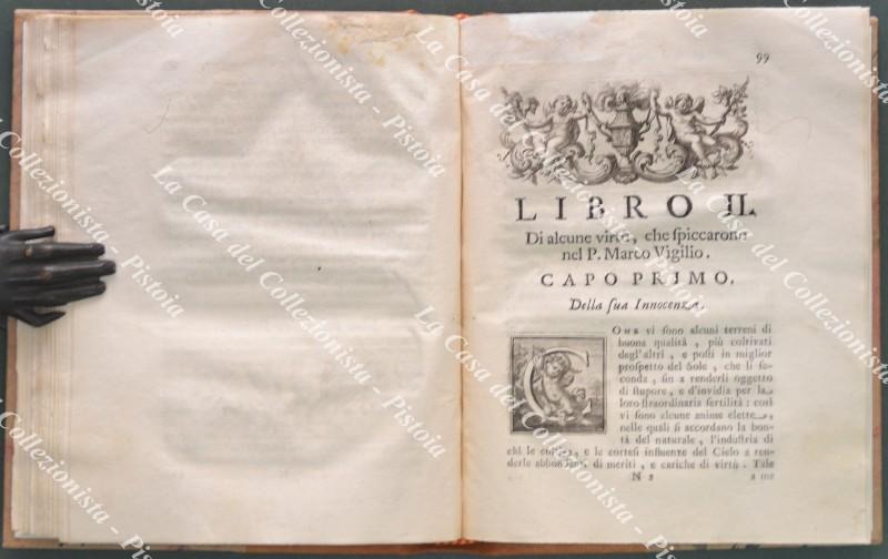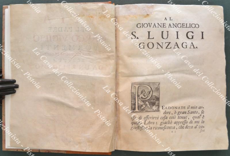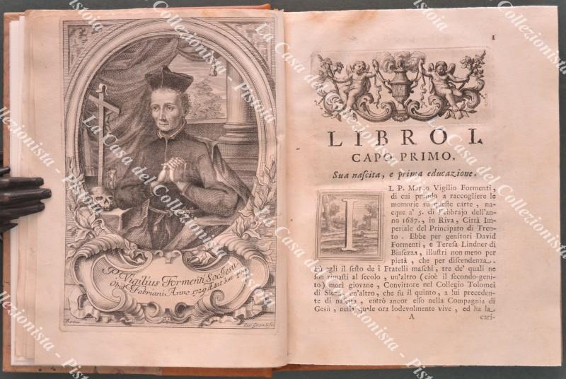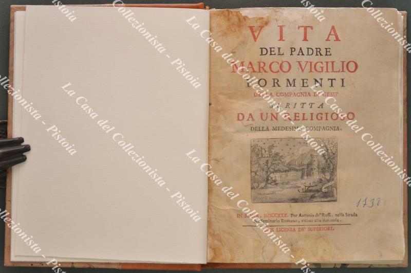 (Agiografia) GALLUZZI FRANCESCO MARIA. VITA DEL PADRE MARCO VIGILIO FORMENTI DELLA COMPAGNIA DI GESU’ SCRITTA DA UN RELIGIOSO DELLA MEDESIMA COMPAGNIA. Roma, Antonio de’ Rossi, 1730. Cm 17,7x21,8, pregevole legatura recente in mezza pelle con piatti marmorizzati e al dorso nervi e titolo in oro. Pp. 16 non numerate comprensive del ritratto del Formenti alla fine dell’introduzione, pp. 158, manca alla fine una carta bianca. Iniziali e fregi xilografici. Esemplare completo ma con difetti: frontespizio sporco e con restauri, varie carte iniziali e finali con aloni e restauri senza però perdita di testo. (Rif.F0590-74)