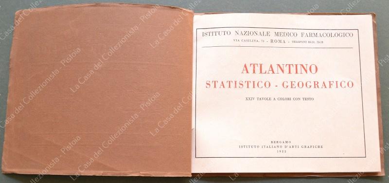 Atlante. ATLANTINO STATISTICO - GEOGRAFICO XXIV TAVOLE A COLORI CON TESTO. Omaggio dell'Istituto Nazionale Medico Farmacologico di Roma. Bergamo, Ist. It. Arti Grafiche, 1922. Cm 20x17, brossura editoriale illustrata. Ottima conservazione. (Rif.F8172)