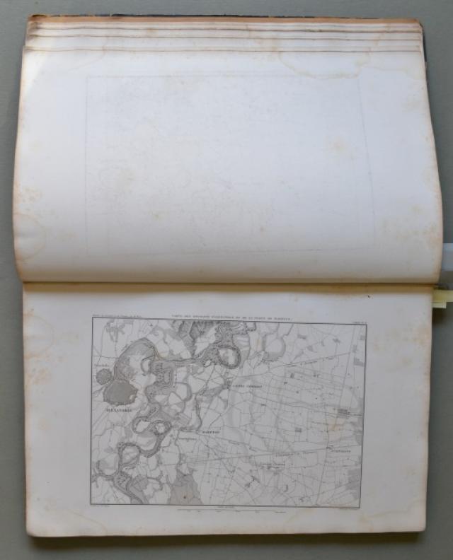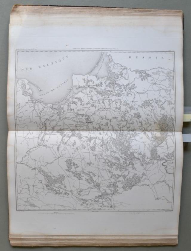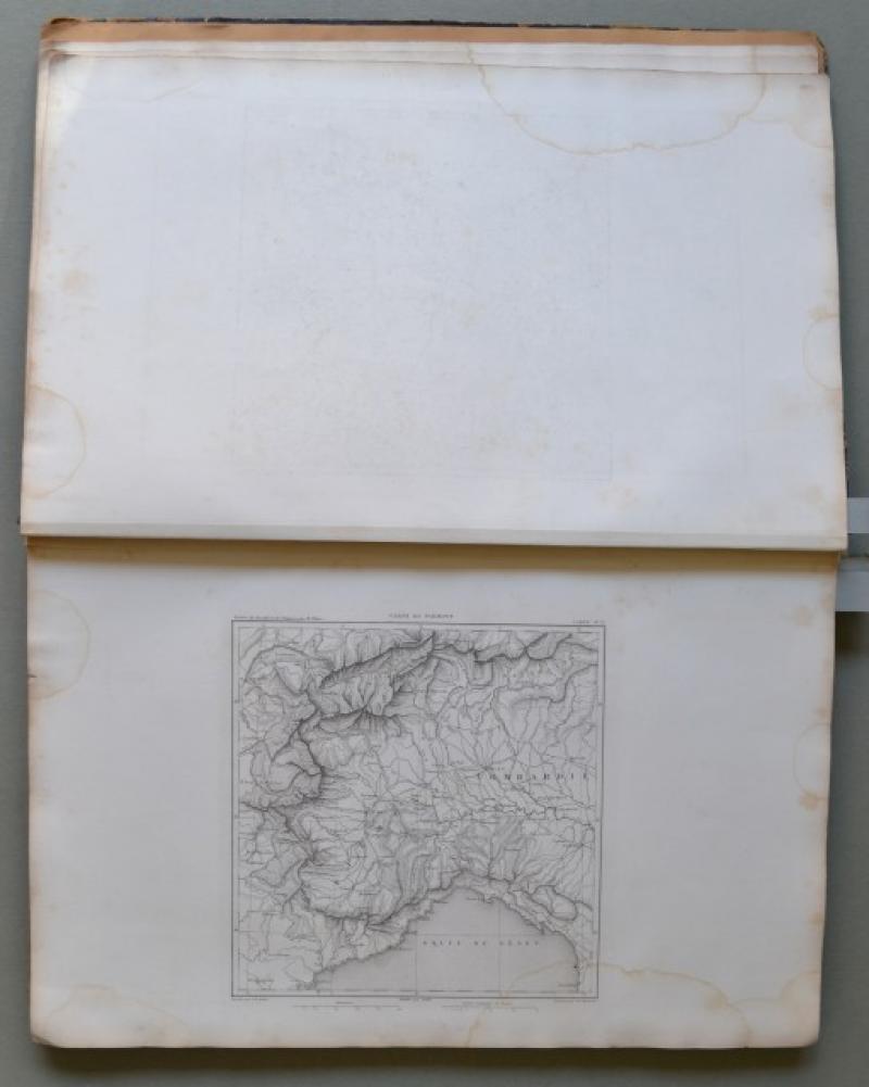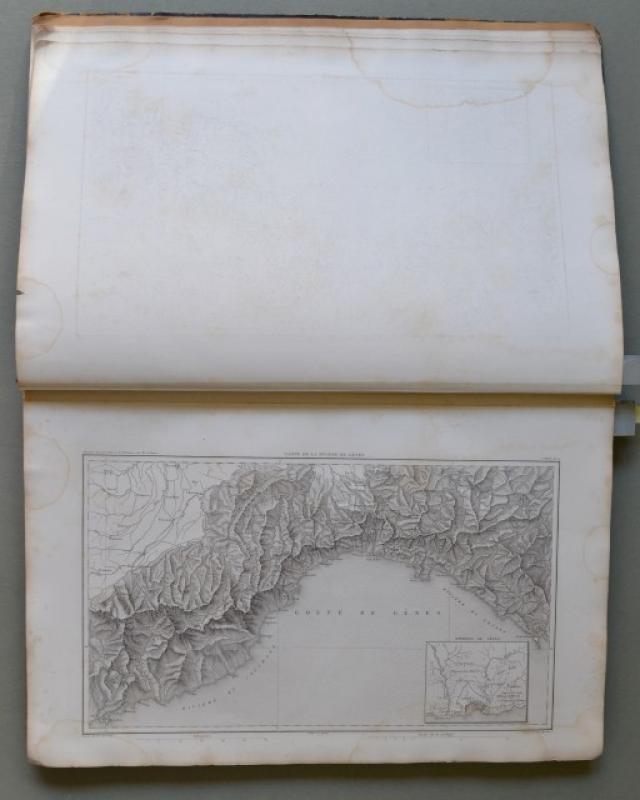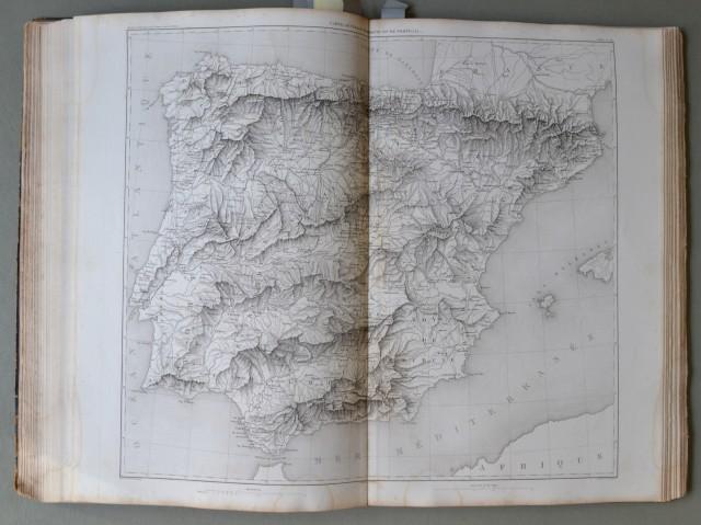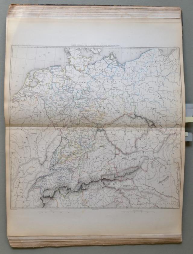 Atlante storico. THIERS. ATLAS DE L'HISTOIRE DU CONSULAT ET DE EMPIRE. Dressé et dessinè sout la direction de M. Thiers par MM. A. Dufour et Duvotenay. Gravè sur acer par Dyonnet. Parigi, Paulin & Lheureux et C., 1859. In folio (cm 28x43,5). Modesta mezza tela dell'epoca (allentata e in cattive condizioni) contenente 66 carte (alcune a doppia pagina) di cui 4 italiane (Piemonte, Riviera di Genova, Valle d'Aosta, Alessandria e piana di Marengo). Esemplare allentato, aloni marginali. (Rif.C2196-733/64)