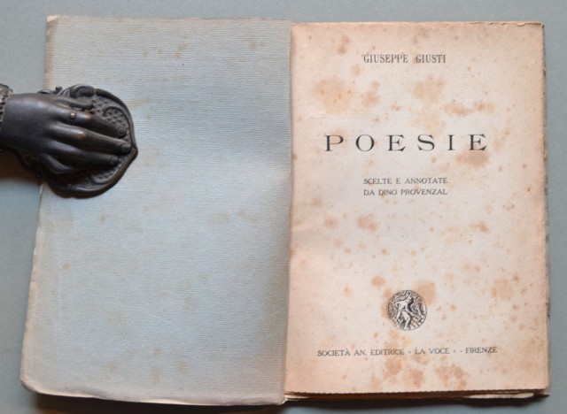 Giuseppe Giusti. POESIE. A cura di Dino Provenzal. Firenze, Ediz. La Voce, 1924. In 16'°, brossura editoriale, pp. 55 + 22 di catalogo generale delle Edizioni La Voce. Fioriture diffuse. (Rif.A7242)
