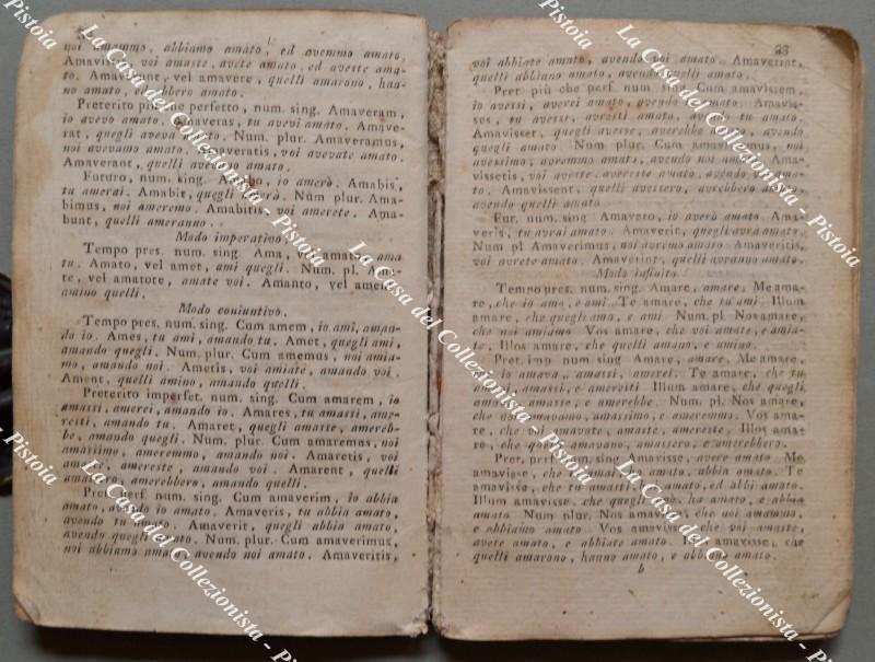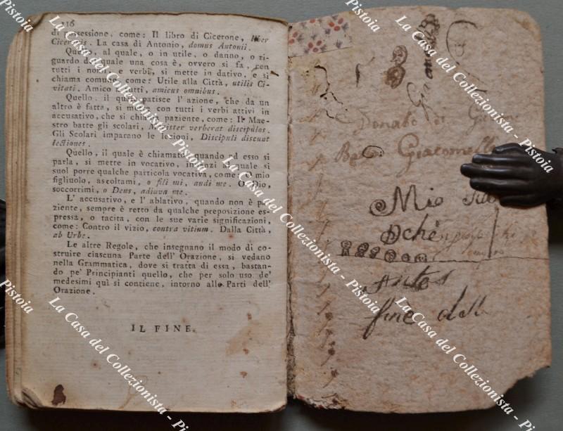 GRAMMATICA anno 1805. PRINCIPJ GRAMMATICALI PER L'ACQUISTO DELLA LINGUA LATINA, E ITALIANA AD USO DELLE SCUOLE PIE. Firenze, Stamp. Bonducciana, 1805. Cm 10x15, modesta cartonatura coeva, pp. 116. Completo ma con vari segni d'uso. (Rif.F5812)