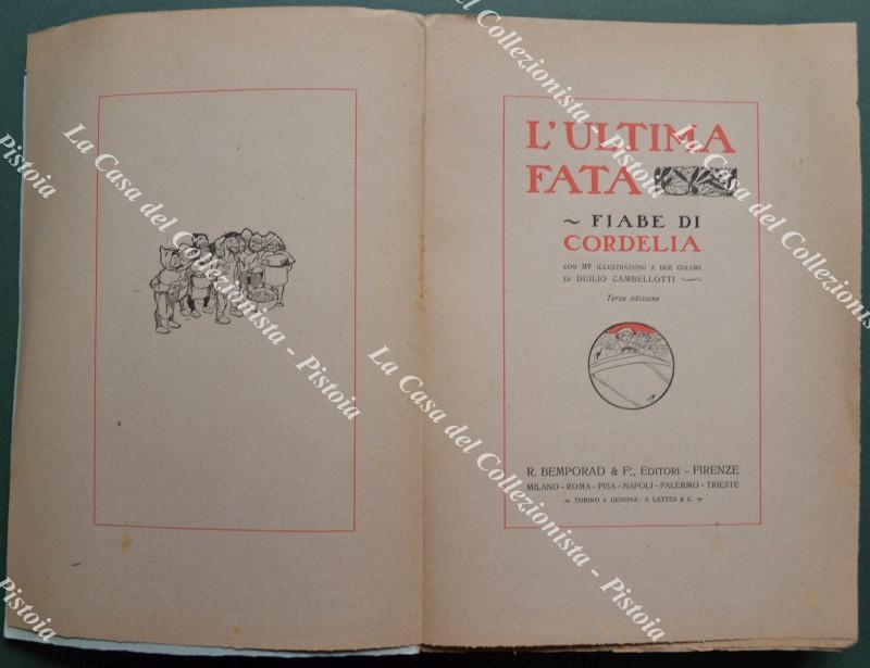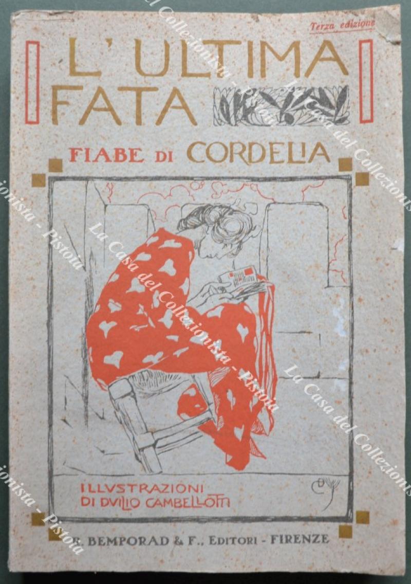 (Libri per l'infanzia) CORDELIA. L'ULTIMA FATA. Fiabe di CORDELIA. Con 37 illustrazioni a due colori di Duilio Cambellotti. Terza edizione. Firenze, Bemporad, 1909. Cm 17,5x25, brossura illustrata editoriale, pp. (4) + 304 + (2). Esemplare intonso. Conservazione molto buona, solamente minime usure. (Rif.F7506-77)